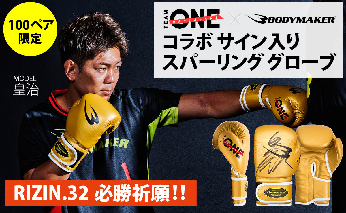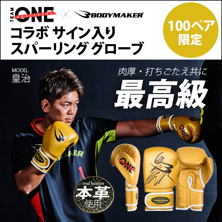 EVENT1:KOUZI040GO TEAM ONE×BODYMAKER コラボ スパーリンググローブ ゴールド 生写真付き【限定20組】購入者にはイベント後皇治選手と一緒に2ショットで写真撮影できる撮影引換券がもらえる!