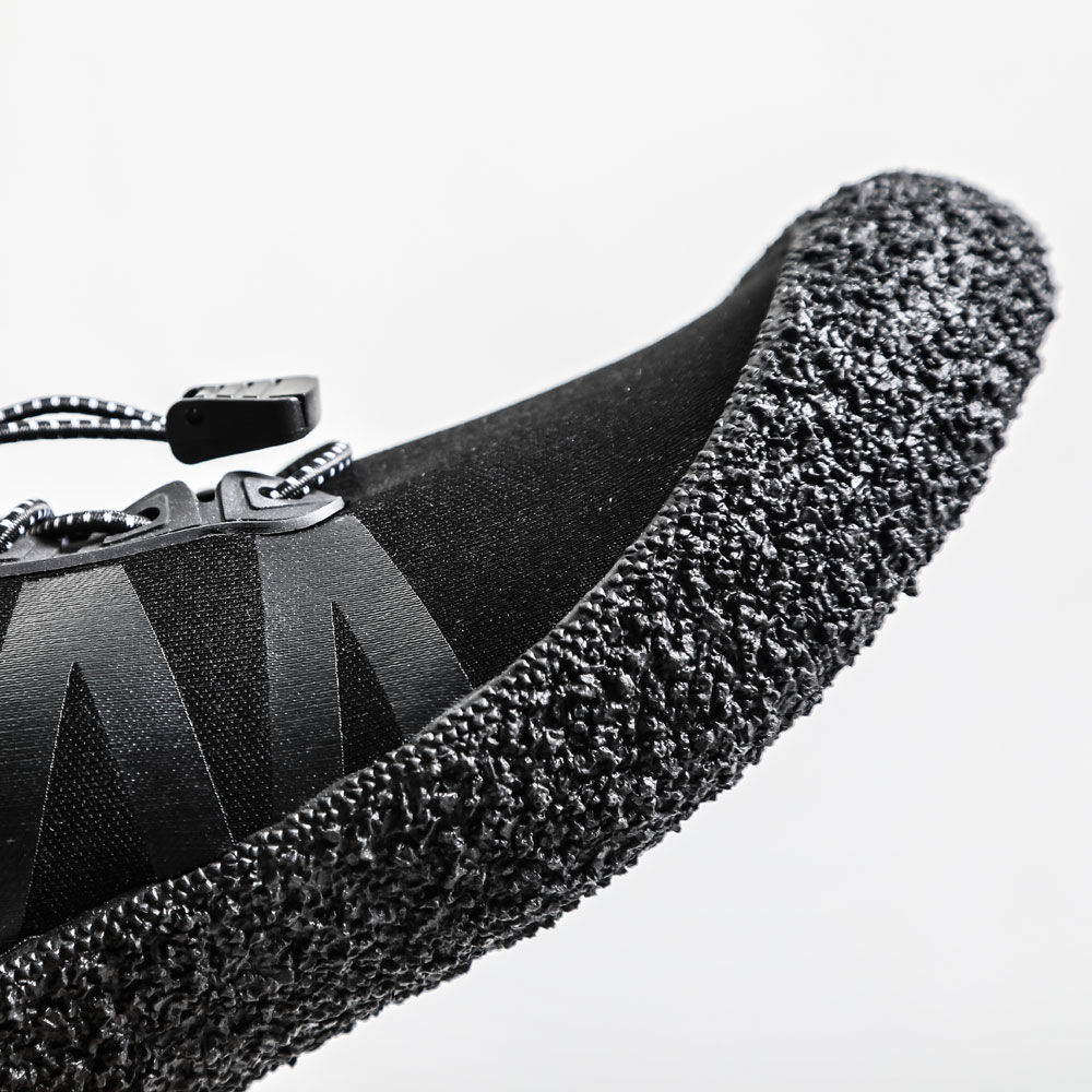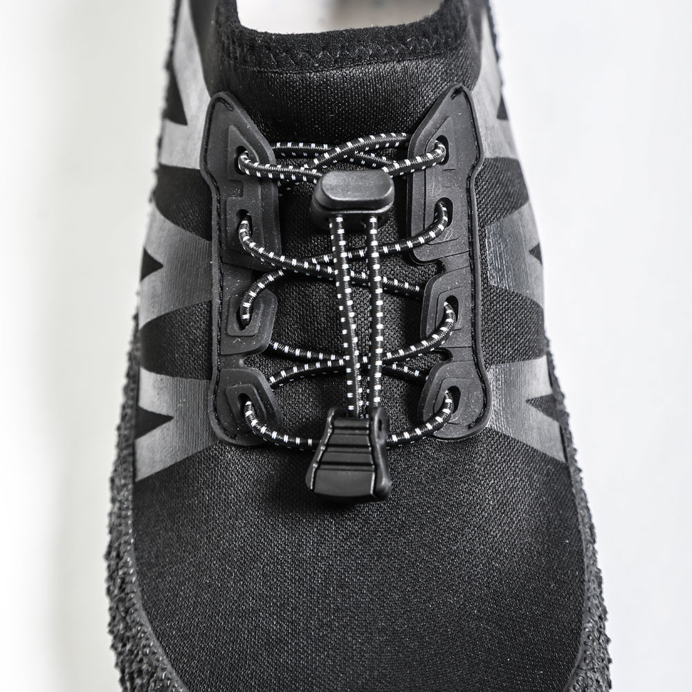 【ゴム紐付き】アッパー部分はゴム紐のスピンドルでアッパー部分のサイズを微調整。よりフィットして快適な履き心地をもたらす。また、履き口にはテープが付いており簡単に着脱することもできます。