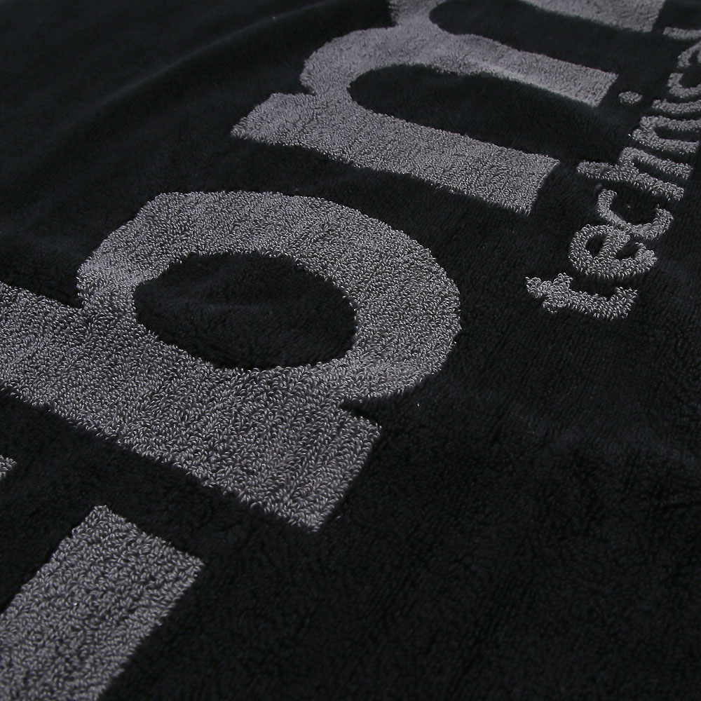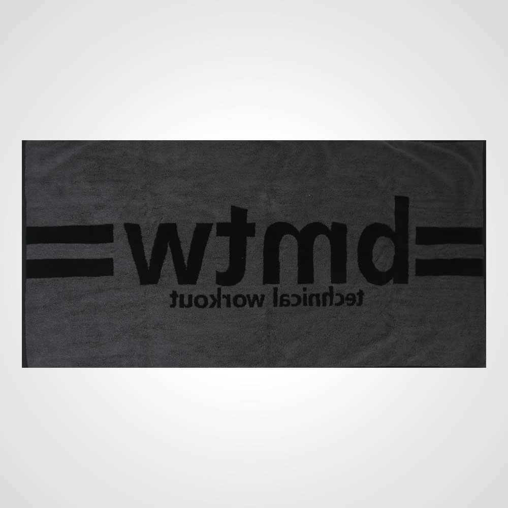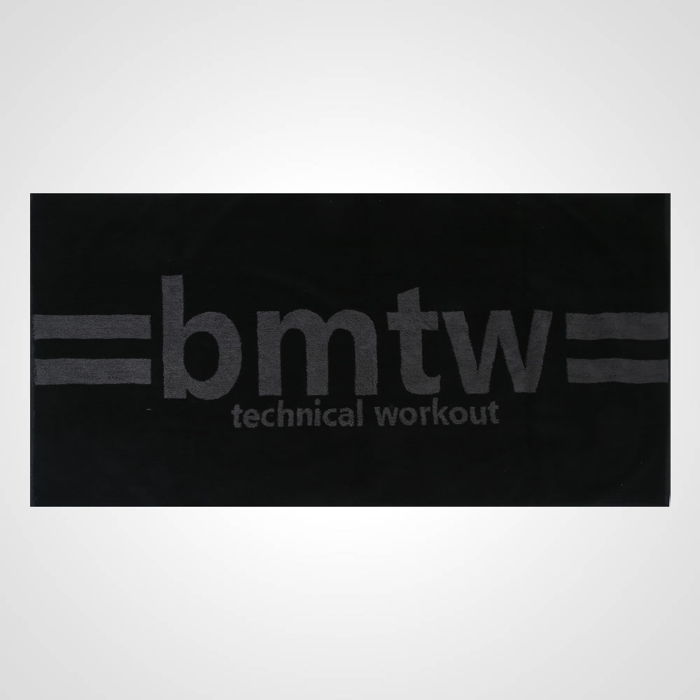 ブラックカラー本体にいっぱいにブランドロゴがデザインされた「bmtw」のバスタオルです。