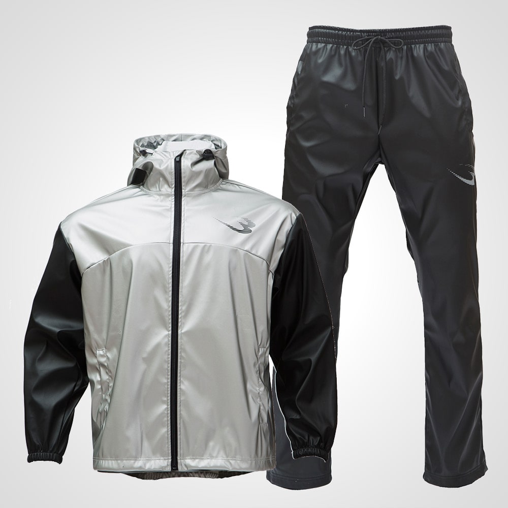 柔らかなストレッチ性のあるポリエステル素材にポリウレタンコーティングを施した素材。高い密閉性。首、袖口のゴム仕様による「短時間で大量発汗」でアスリートの減量や女性のダイエットに人気のサウナスーツです。「抗菌・防臭機能」が加わり、汗による臭いの原因となる菌の繁殖を抑止。衛生面での不安を取り除きました。プリントは反射プリント(リフレクター)を採用。夜間・着用者の安全をサポートします。