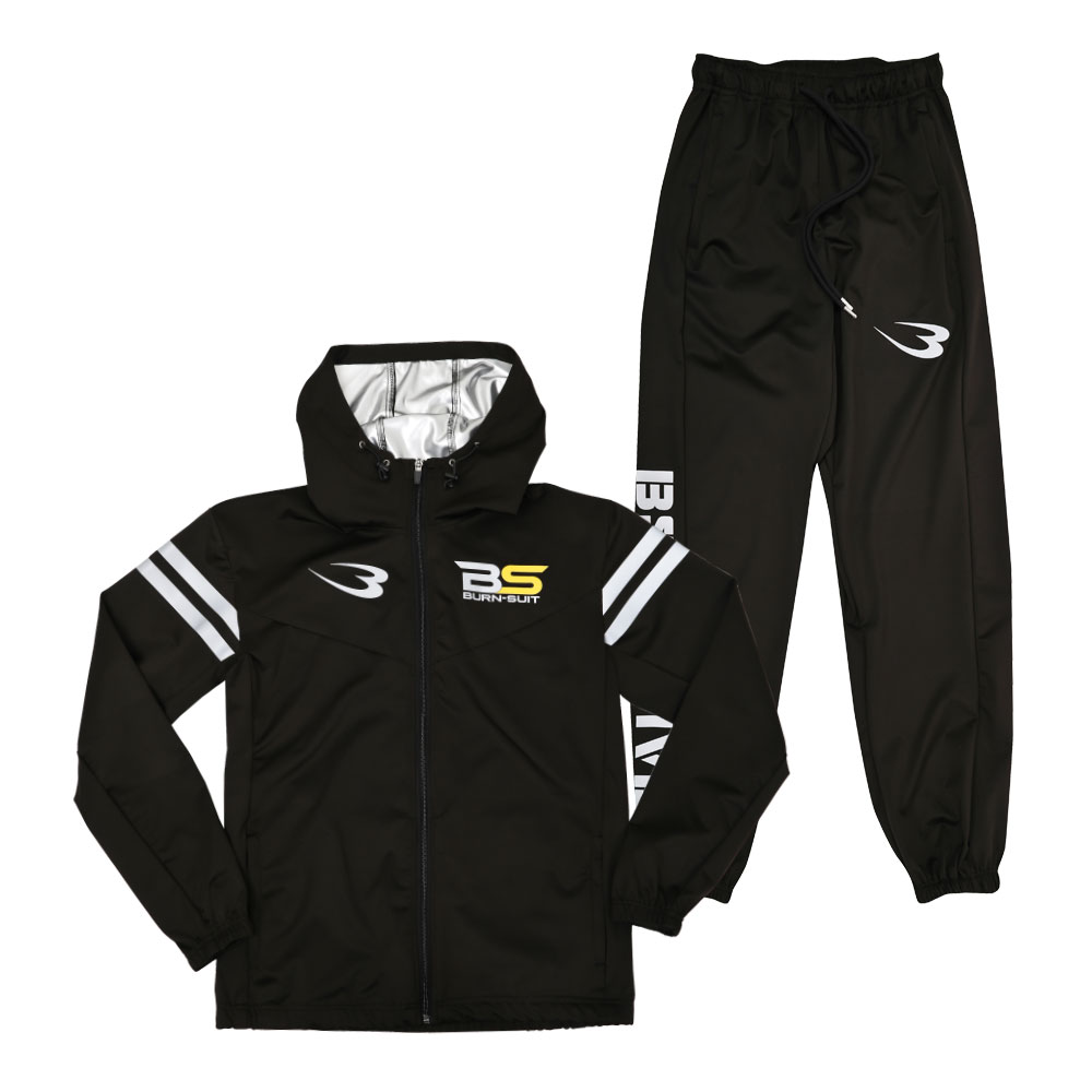 【BURN-SUIT】ポリウレタンコーティングを施した素材で体から発する熱を逃さず閉じ込める!高い保温により効果的な発汗を促します。フロントフルジップのジャケットタイプ。気密性が高い特殊な素材を使用し、体温を外へ逃がさないことで温度が上昇し、発汗効果を促すことが出来ます。従来のサウナスーツ生地からソフトで伸縮性のある生地にバージョンアップしました。フード口のゴムスピンドル、袖口やパンツの裾部分のゴム仕様により密閉性を高めています。前左右ポケット付き。アスリートの減量や女性のダイエットに人気のアイテムです。生地には「抗菌・防臭機能」を施し、汗による臭いの原因となる菌の繁殖を抑止。衛生面での不安を取り除きました。プリントに反射プリント(リフレクター)を採用。夜間・着用者の安全をサポートします。