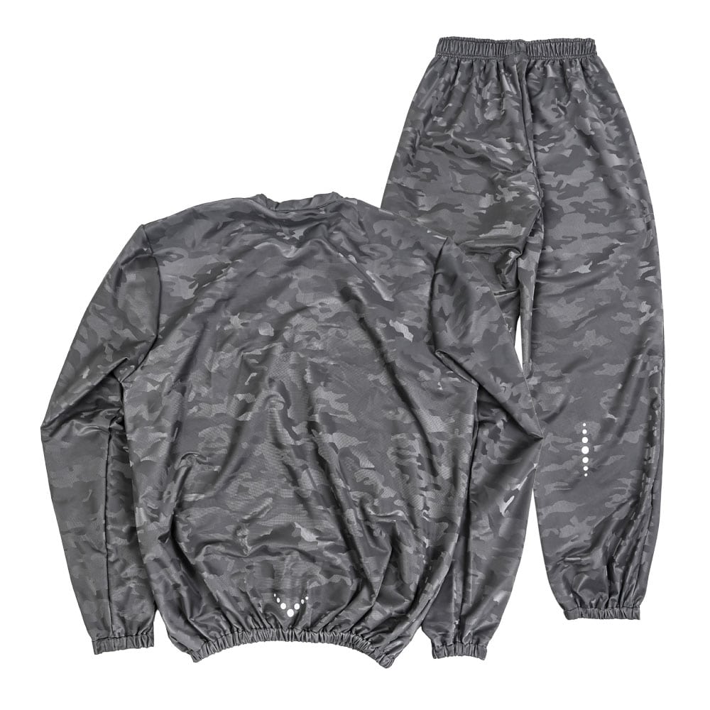 柔らかなストレッチ性のあるポリエステル素材にポリウレタンコーティングを施した素材。高い密閉性。首、袖口のゴム仕様による「短時間で大量発汗」でアスリートの減量や女性のダイエットに人気のサウナスーツです。「抗菌・防臭機能」が加わり、汗による臭いの原因となる菌の繁殖を抑止。衛生面での不安を取り除きました。プリントは反射プリント(リフレクター)を採用。夜間・着用者の安全をサポートします。