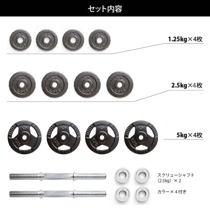 【カラー部分改良のため仕様変更などがございますのでご了承くださいませ】ワークアウトのメニューが広がるトレーニー必携のアイテム!ダンベルトレーニングが快適におこなえます。スクリュー式なので固定の際も安心です。ビギナーからハードユーザーまで、様々なトレーニングライフをサポートできる充実のラインナップ。グリップ部のローレット加工で使いやすさも向上!あなたのベスト&マストアイテムをお選び下さい。