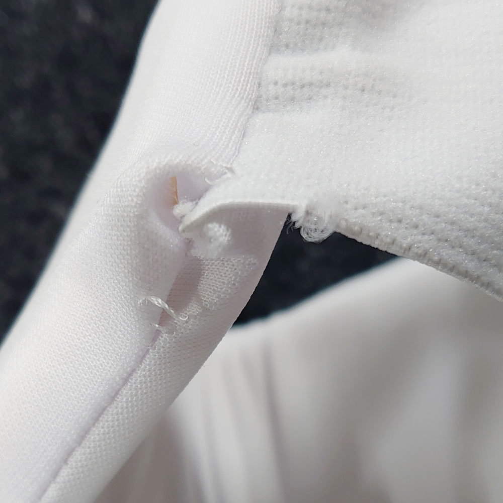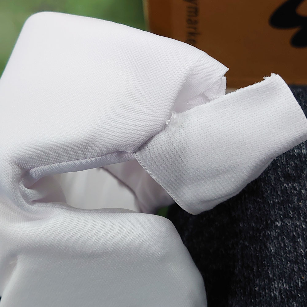 パッドを3パーツにし動きに対応。安全性も確保しています。後ろには2本のゴム付き、上下でずり落ちを防ぎます。下側には伸縮性のあるカットソー生地を切り替えて膝下にフィットします。