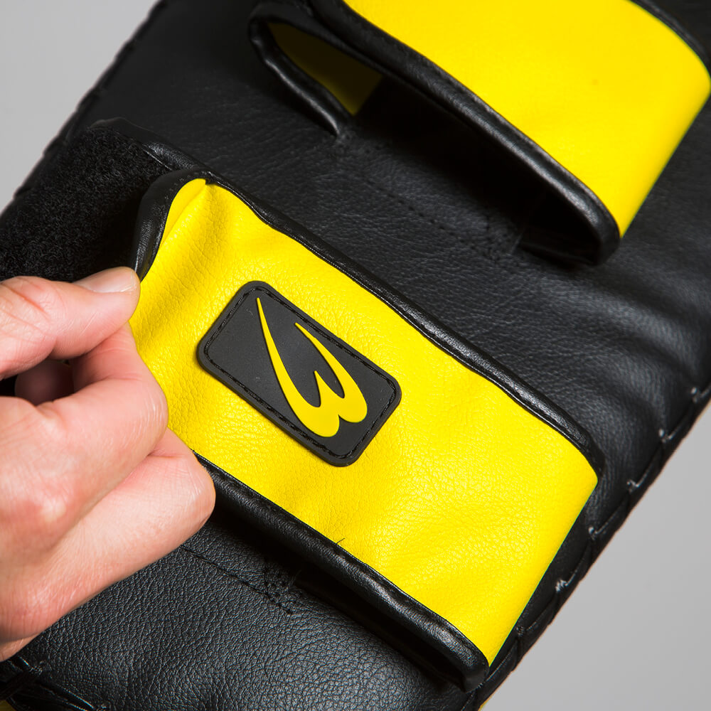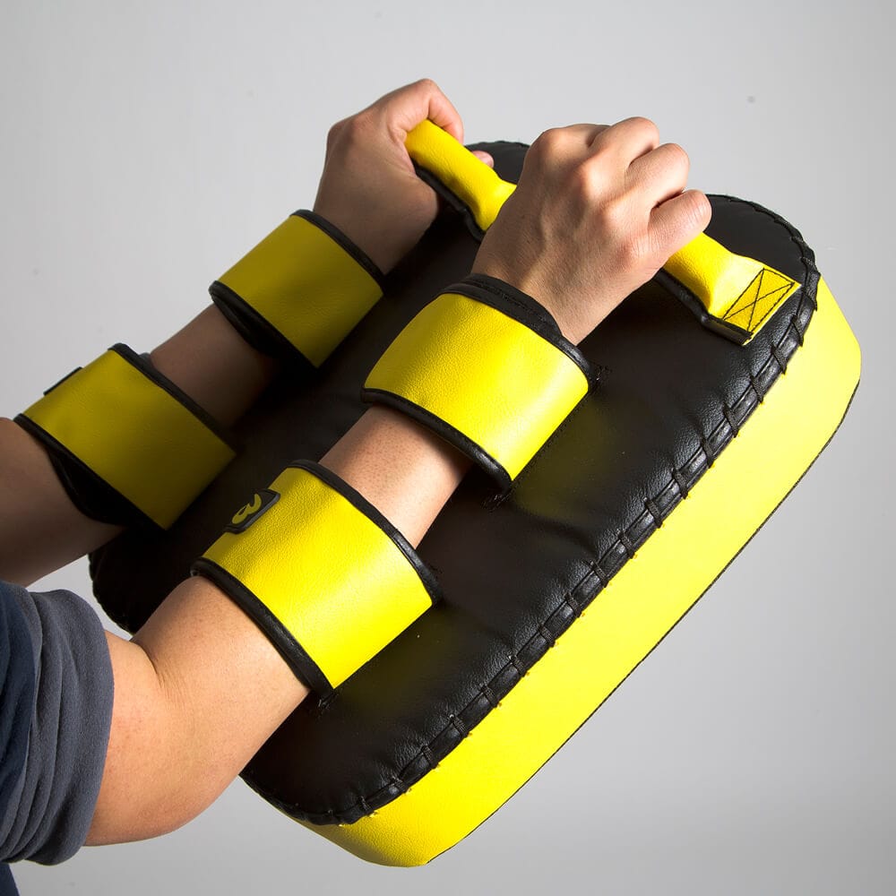 高品質で耐久性に優れた素材を使用。ハンドルはしっかりとしたパイプを内蔵し握りやすく、腕部分のホールドバンドは面ファスナーでしっかりと固定出来る仕様。2段階でしっかり支えプロ級の衝撃の強いパンチもしっかりと吸収します。あらゆる角度からの打撃をしっかりと受け止め、衝撃も吸収。 打つ側、受ける側、どちらにも使いやすいのが魅力です。光沢のあるゴールドとブラックの限定(LIMITED)モデル。※1個売り