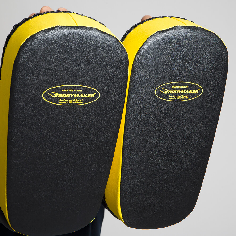 1個売り。あらゆる角度からの打撃をしっかりと受け止め、衝撃も吸収。 打つ側、受ける側、どちらにも使いやすいのが魅力です。優れた耐久性が、本革を凌ぐタフさを実証します。正面にBODYMAKERロゴプリントが付きます。ハンドルはしっかりとしたパイプを内蔵し、腕部分のホールドバンドは2段階でしっかり支え、またサイズ調整も面テープで簡単にできます。ホールドバンドには Bロゴのシリコンバッジがつきます。