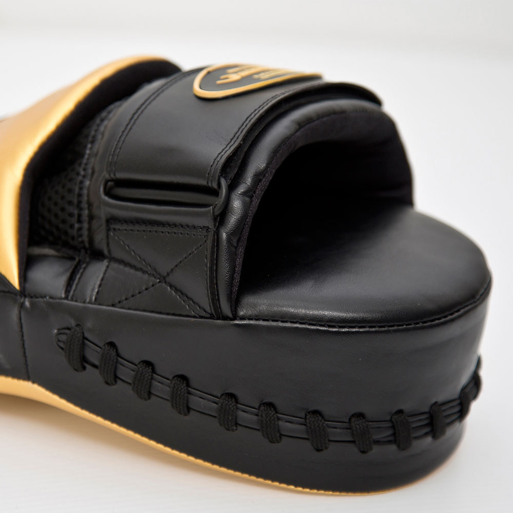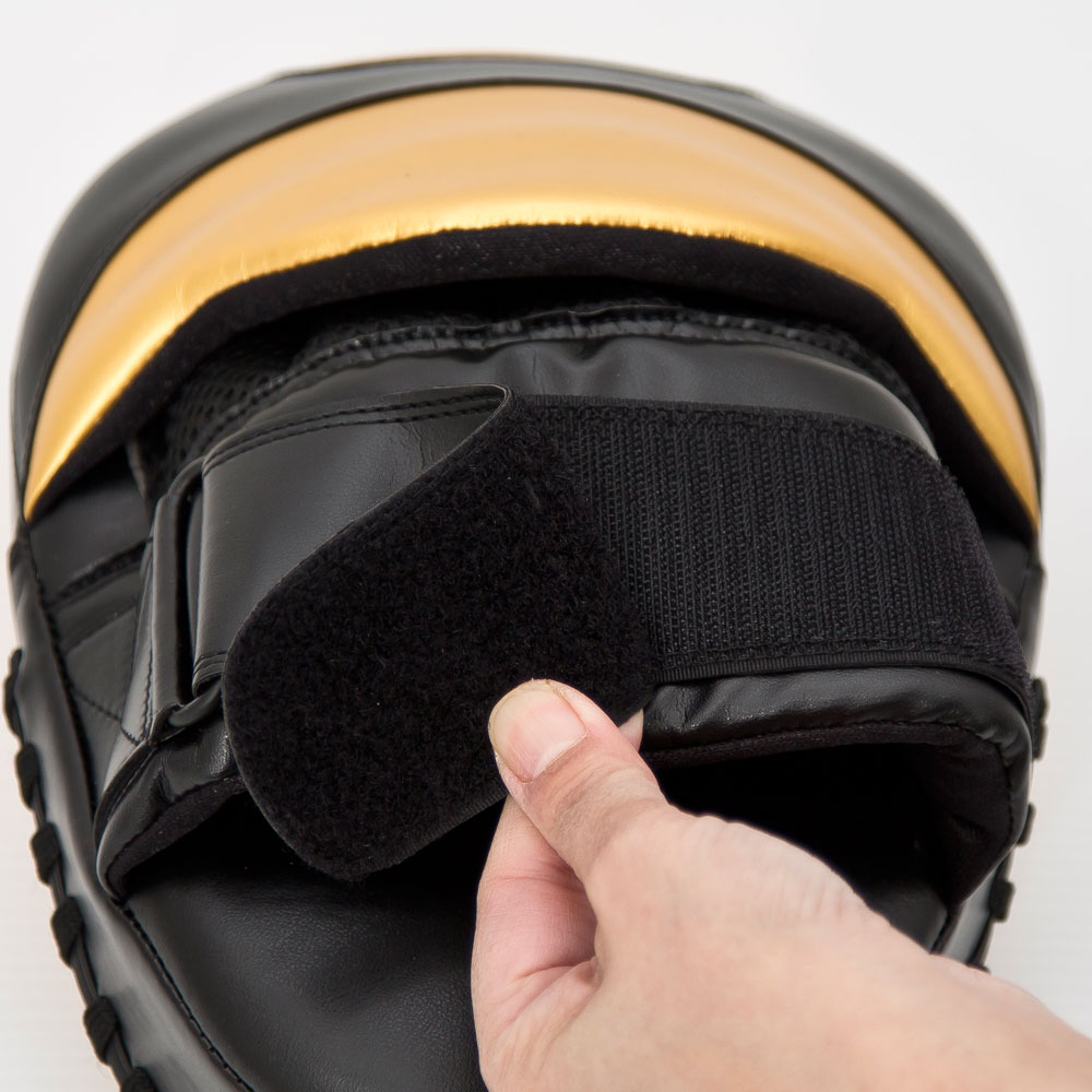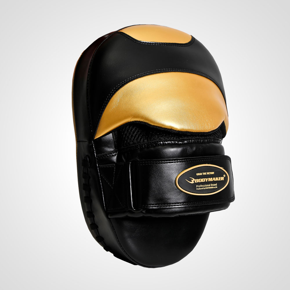 なだらかな湾曲があらゆる角度の打撃を受け止める。高品質で耐久性に優れた本革を使用しています。厚さ40mm、小型でコンパクトかつ軽量設計となっておりコントロールしやすく、受ける側も打つ側も使いやすいパンチングミットです。ピンポイントにターゲットを狙える練習に。光沢のあるゴールドとブラックの限定(LIMITED)モデルです。