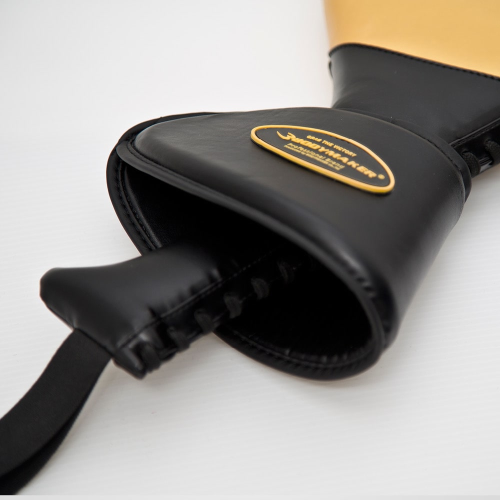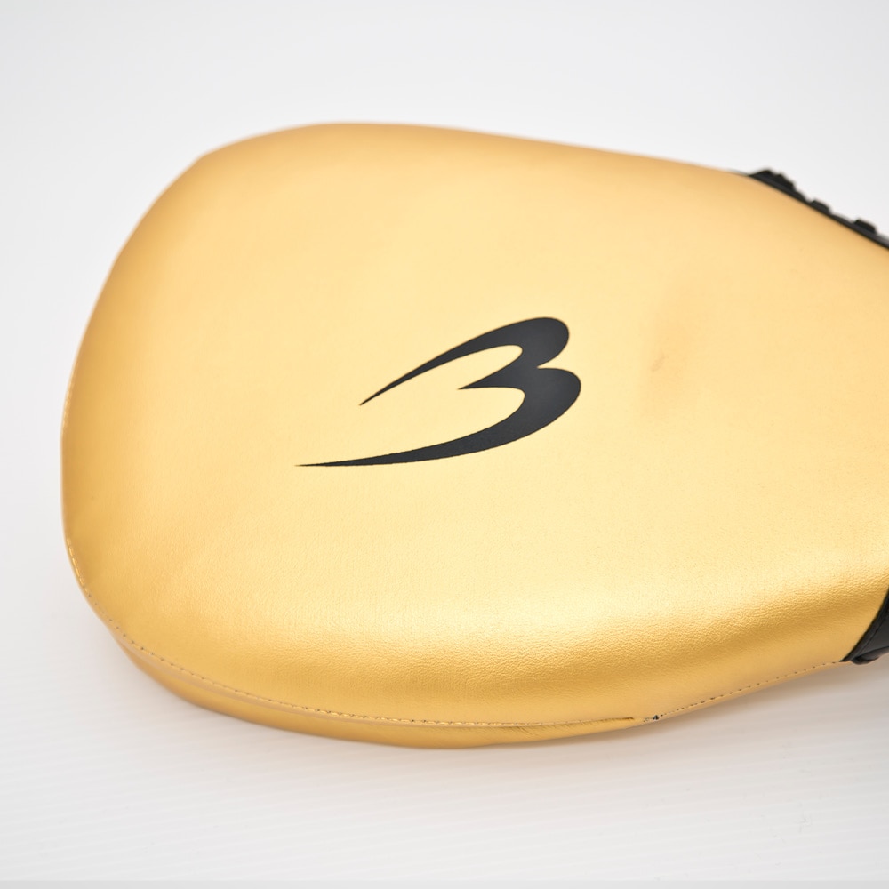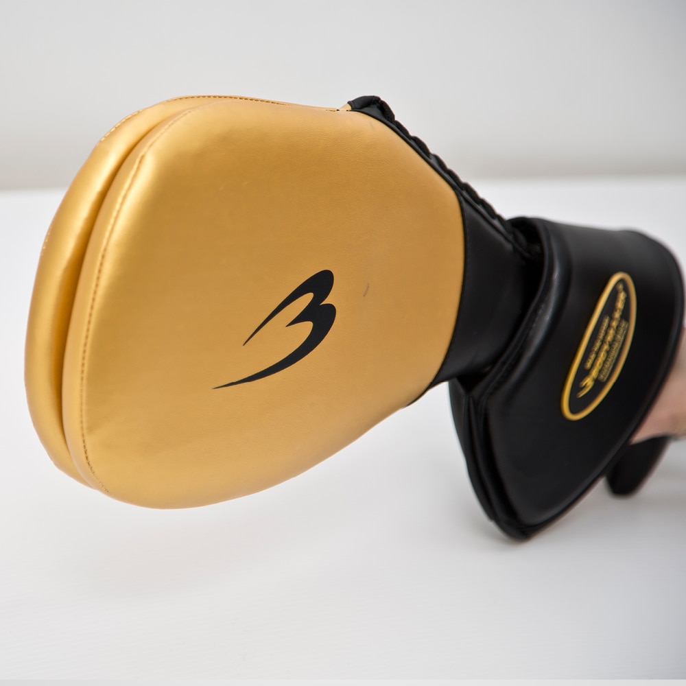 なだらかな湾曲があらゆる角度の打撃を受け止める。高品質で耐久性に優れた本革を使用しています。厚さ40mm、小型でコンパクトかつ軽量設計となっておりコントロールしやすく、受ける側も打つ側も使いやすいパンチングミットです。ピンポイントにターゲットを狙える練習に。光沢のあるゴールドとブラックの限定(LIMITED)モデルです。
