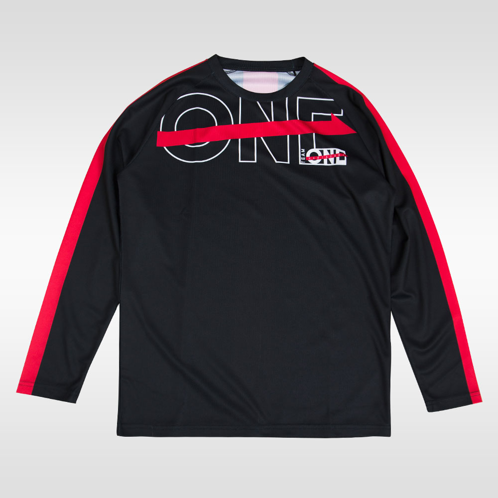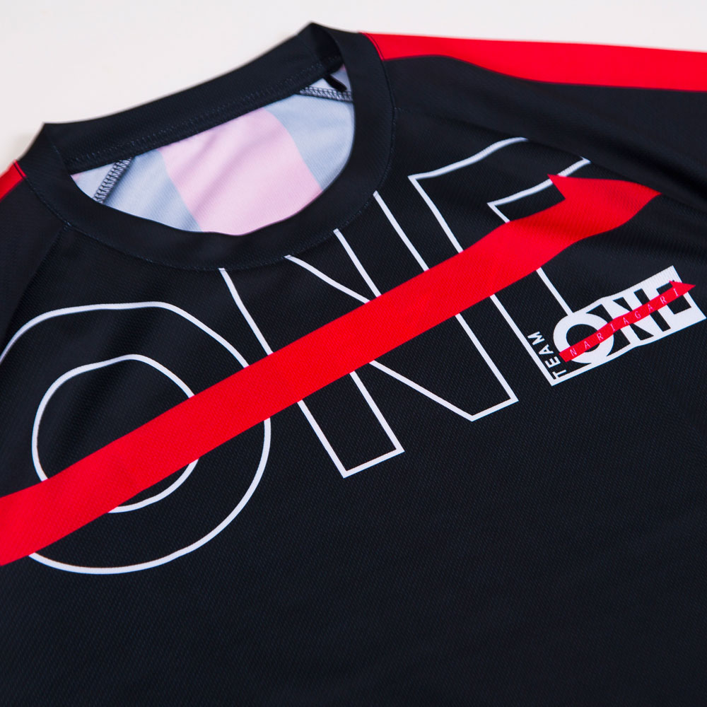 TEAM ONEとのコラボ DRY Tシャツ。TEAM ONEのロゴにある「NARIAGARI」のRed Arrow Line(赤い矢印線)を大胆に用いて、赤のラインが効いたデザイン。それぞれのロゴも大きくあしらったカッコイイ1枚に仕上げました。
