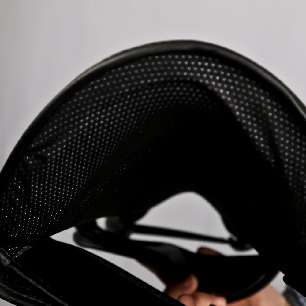パンチを受けた顔面の衝撃を最小限に防ぐ、安全性の高いヘッドガードです。視野が広く、初心者から上級者まで、幅広いニーズに対応します。顎下のベルトは面ファスナーでサイズの調節が可能です。後ろ面ファスナー仕様で脱着しやすくなっています。光沢のあるブラックとゴールドを組み合わせたスタイリッシュなカラーリング。