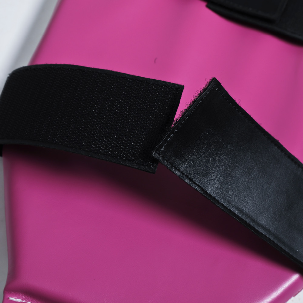 足裏のゴムテープと、ふくらはぎ部分の2本のベルトで装着の容易さと確かなフィット感を実感できるレガース。最高級本革製なので、激しい打撃の応酬を繰り返しても、ずれにくく装着感が保たれます。安全性の高いレガースです。