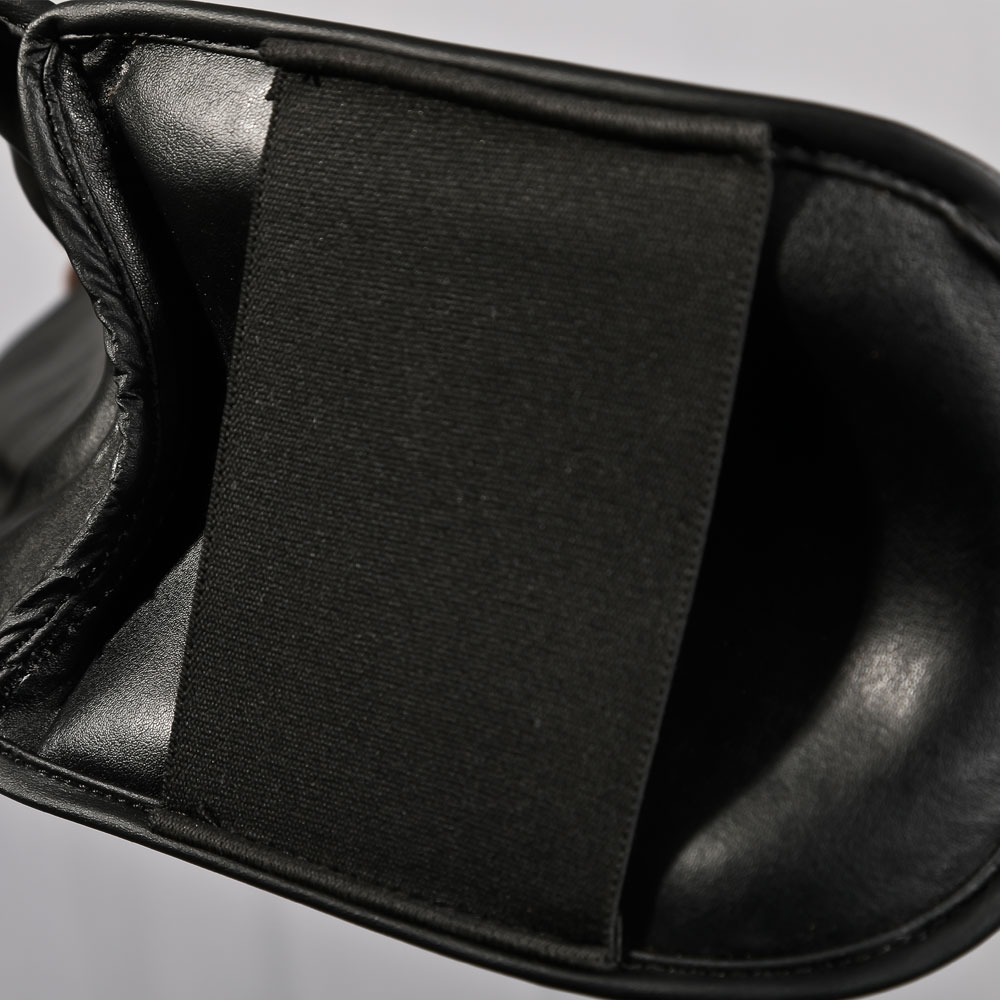 パンチを受けた顔面の衝撃を最小限に防ぐ、安全性の高いヘッドガードです。視野が広く、初心者から上級者まで、幅広いニーズに対応します。顎下のベルトは面ファスナーでサイズの調節が可能です。後ろ面ファスナー仕様で脱着しやすくなっています。光沢のあるブラックとゴールドを組み合わせたスタイリッシュなカラーリング。