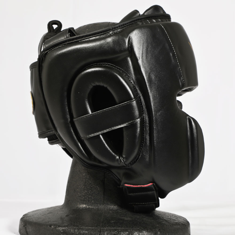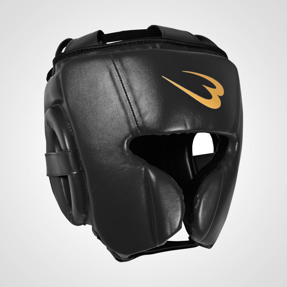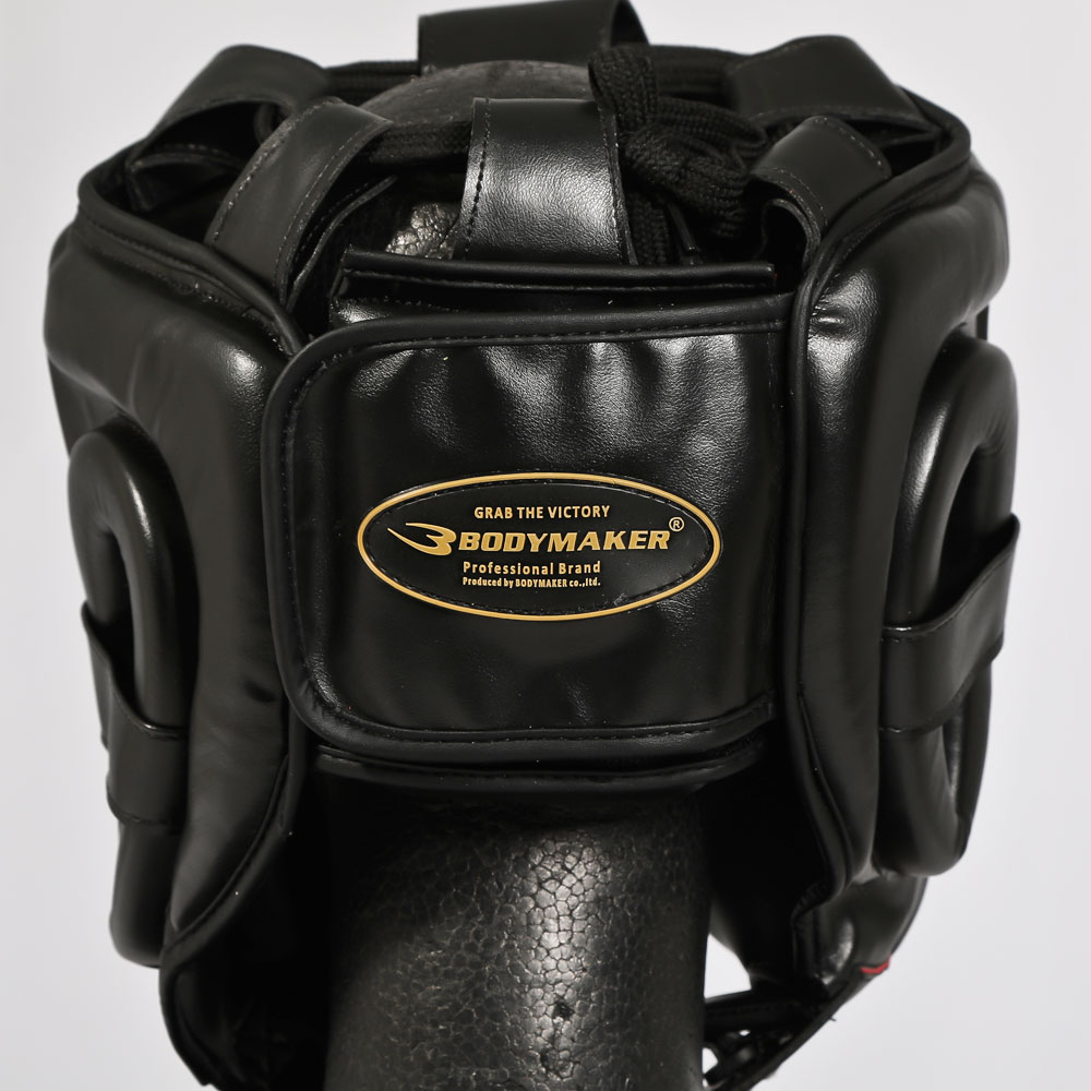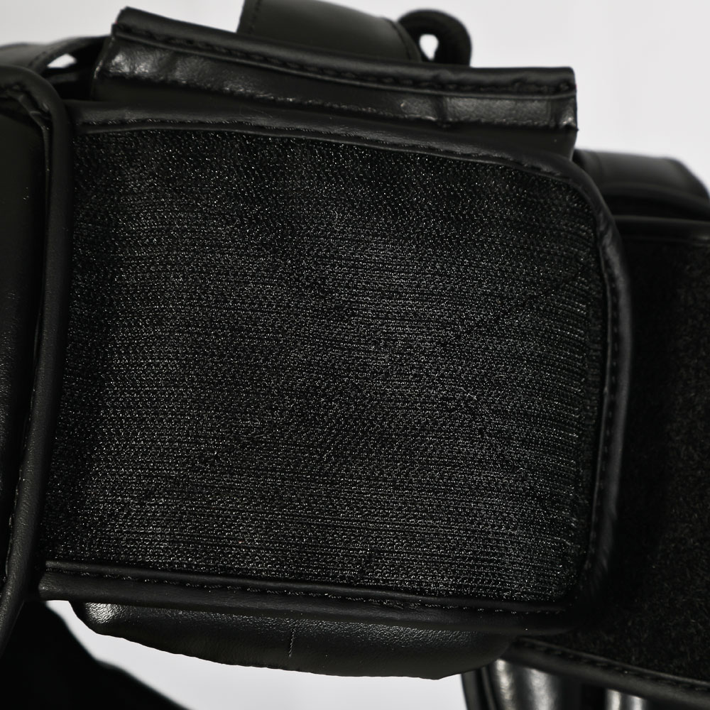 パンチを受けた顔面の衝撃を最小限に防ぐ、安全性の高いヘッドガードです。視野が広く、初心者から上級者まで、幅広いニーズに対応します。顎下のベルトは面ファスナーでサイズの調節が可能です。後ろ面ファスナー仕様で脱着しやすくなっています。光沢のあるブラックとゴールドを組み合わせたスタイリッシュなカラーリング。