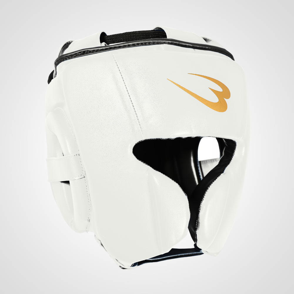 パンチを受けた顔面の衝撃を最小限に防ぐ、安全性の高いヘッドガードです。視野が広く、初心者から上級者まで、幅広いニーズに対応します。顎下のベルトは面ファスナーでサイズの調節が可能です。後ろ面ファスナー仕様で脱着しやすくなっています。光沢のあるブラックとゴールドを組み合わせたスタイリッシュなカラーリング。