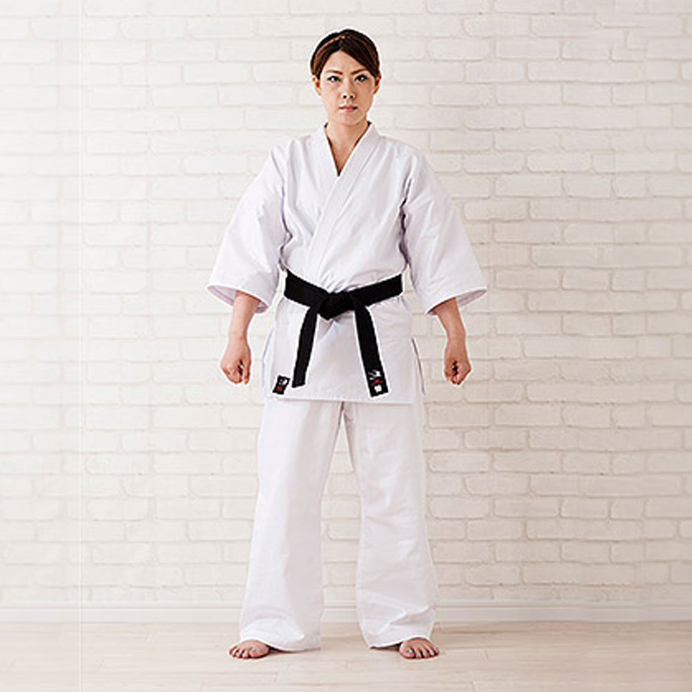 上衣はハードな稽古や試合に耐えられる11号帆布、下衣は軽くて丈夫な葛城織を採用。従来純白道衣でも3から5%の収縮率があったものを、最新技術のサフォライズ加工仕上げにより、2%以内に横糸収縮を押さえました。着崩れを防ぐレジン加工が、空手衣本来の動きやすさを保ちます。