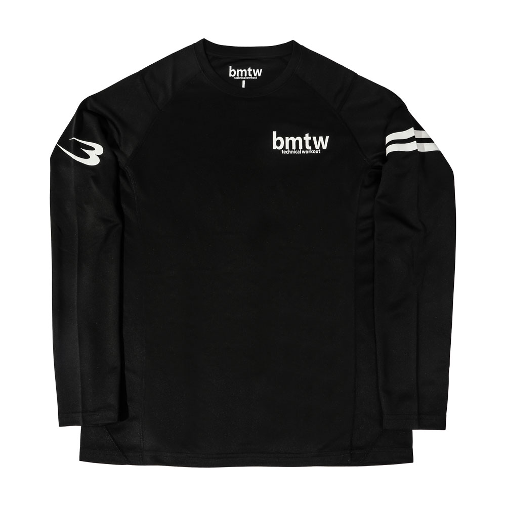 前身頃に大きくBロゴのアウトラインをデザイン。左胸上に「bmtw BY BODYMAKER TECHNICAL WORKOUT」の立体シリコンプリント。後身頃には、「bmtw」のアイコンでもある2本ラインをリフレクタープリントで。
