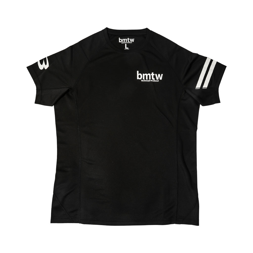 前身頃に大きくBロゴのアウトラインをデザイン。左胸上に「bmtw BY BODYMAKER TECHNICAL WORKOUT」の立体シリコンプリント。後身頃には、「bmtw」のアイコンでもある2本ラインをリフレクタープリントで。