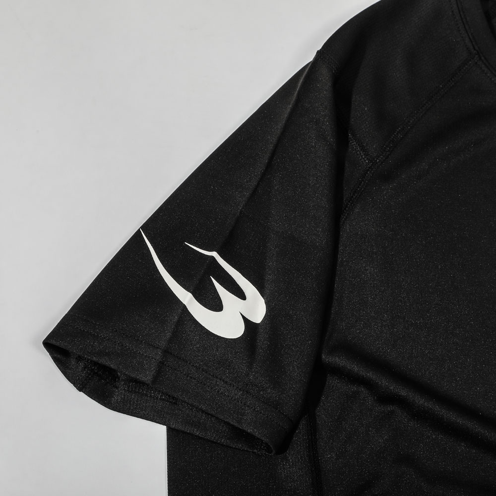 前身頃に大きくBロゴのアウトラインをデザイン。左胸上に「bmtw BY BODYMAKER TECHNICAL WORKOUT」の立体シリコンプリント。後身頃には、「bmtw」のアイコンでもある2本ラインをリフレクタープリントで。