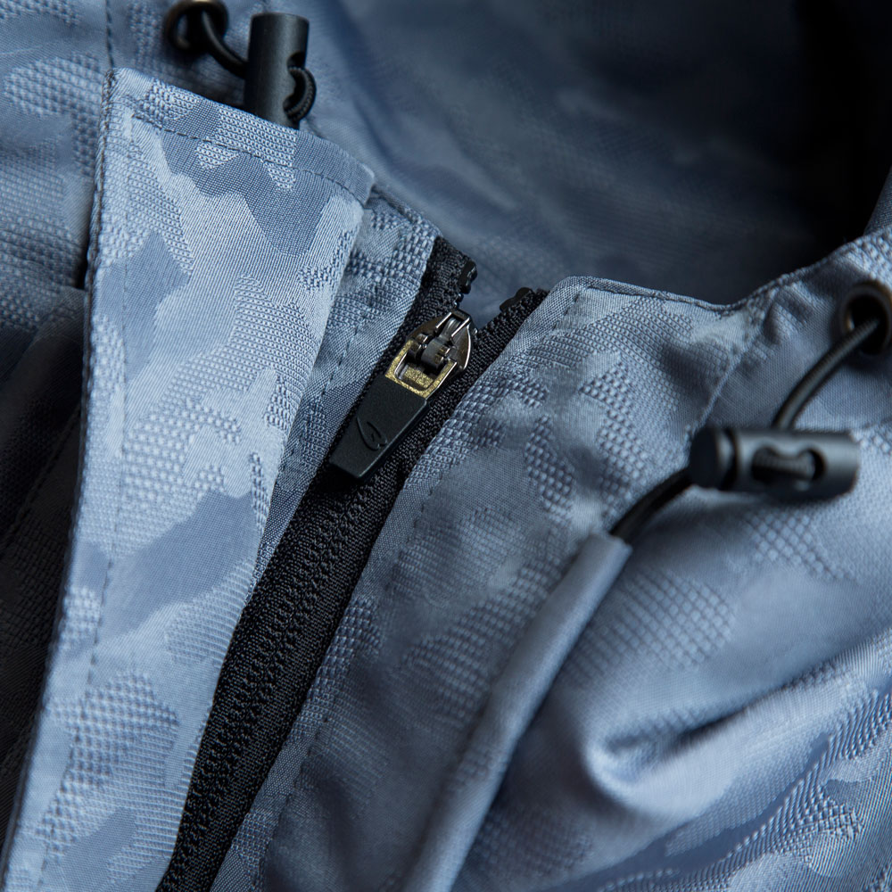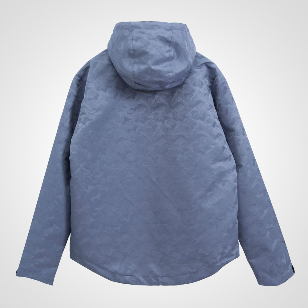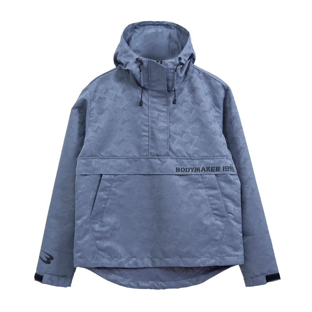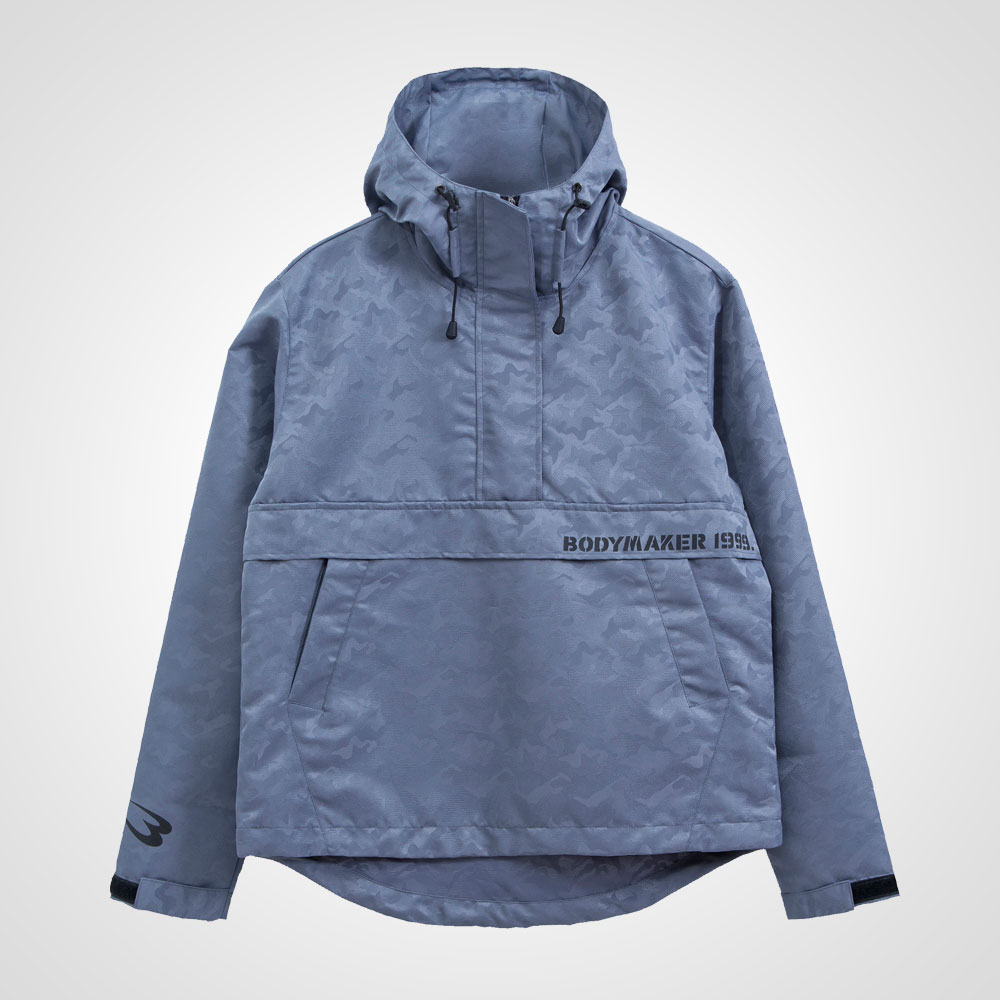 カモフラ柄を織り込んだ後染めジャガード生地で仕立てたプルオーバータイプのブルゾン。