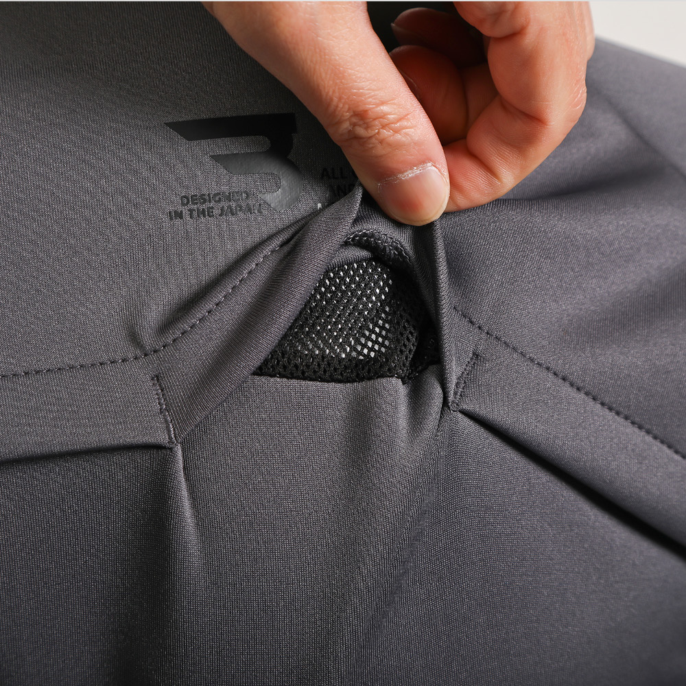 脇から袖下と背中に吸水速乾性に優れたストレッチ素材のメッシュを切替え、