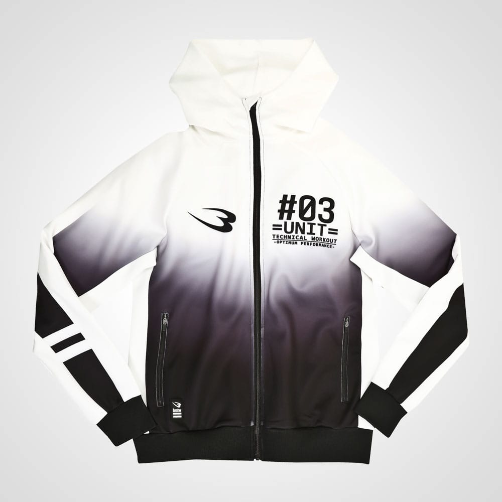 グラデーションがクールなデザインのロングパンツは、ジムやトレーニングのウエアとしてだけでなく、デイリーウエアとして外出にも使えて、部屋着としても着まわしが効きます。左にBロゴ。右に「#03」脇にホワイトのライン。左脚に2本ライン。