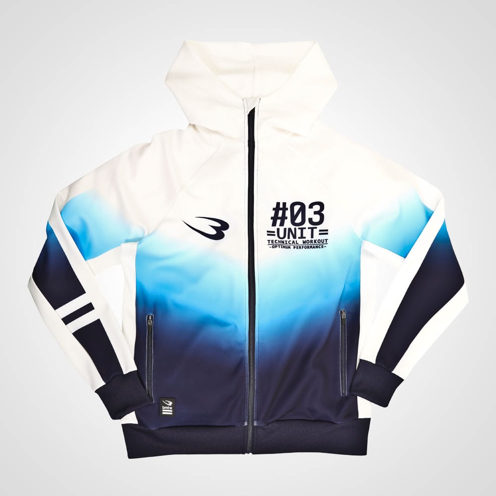 グラデーションがクールなデザインのロングパンツは、ジムやトレーニングのウエアとしてだけでなく、デイリーウエアとして外出にも使えて、部屋着としても着まわしが効きます。左にBロゴ。右に「#03」脇にホワイトのライン。左脚に2本ライン。