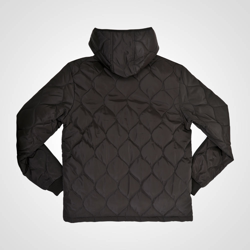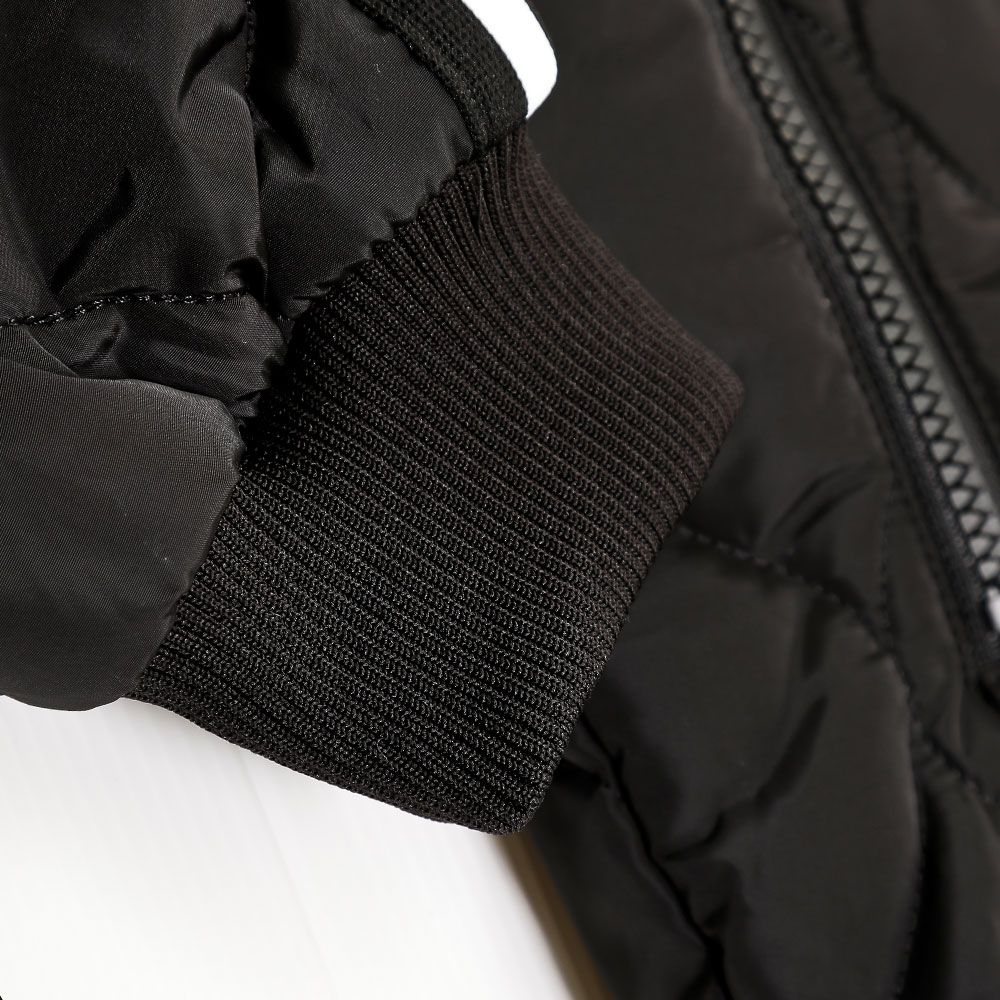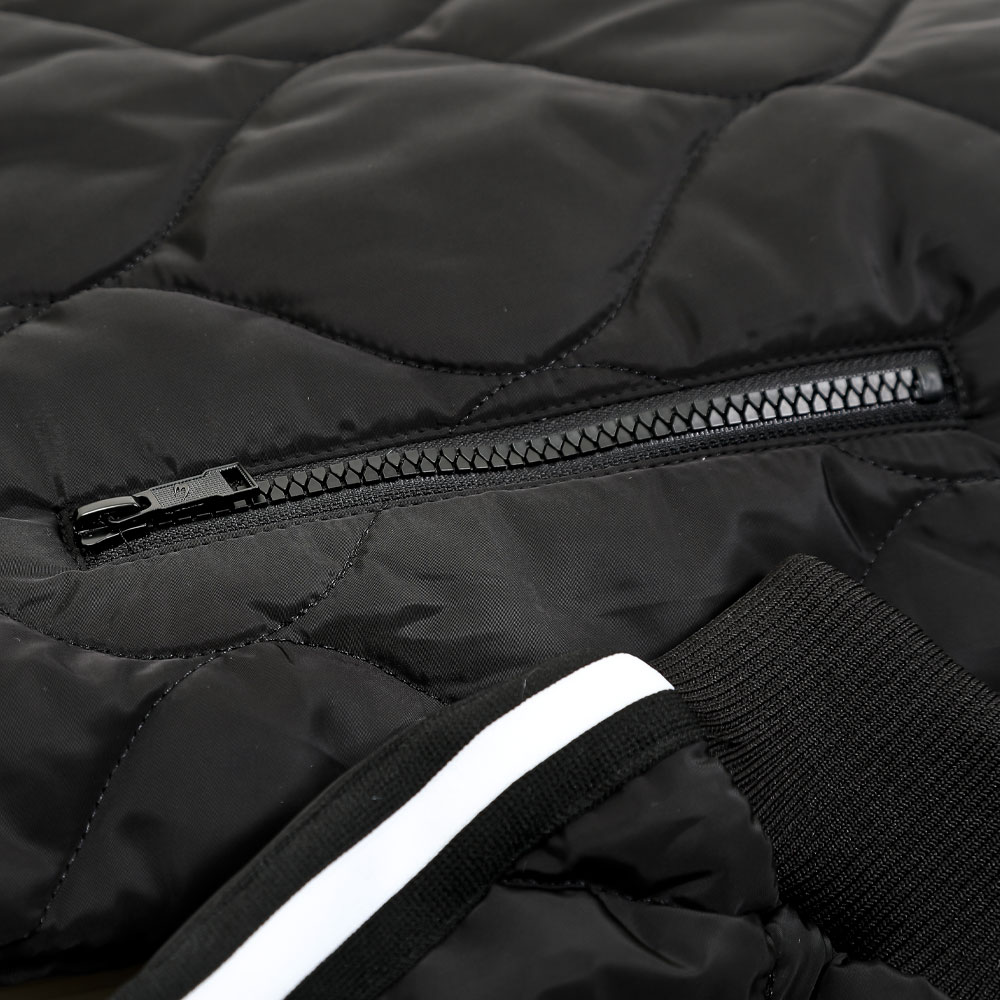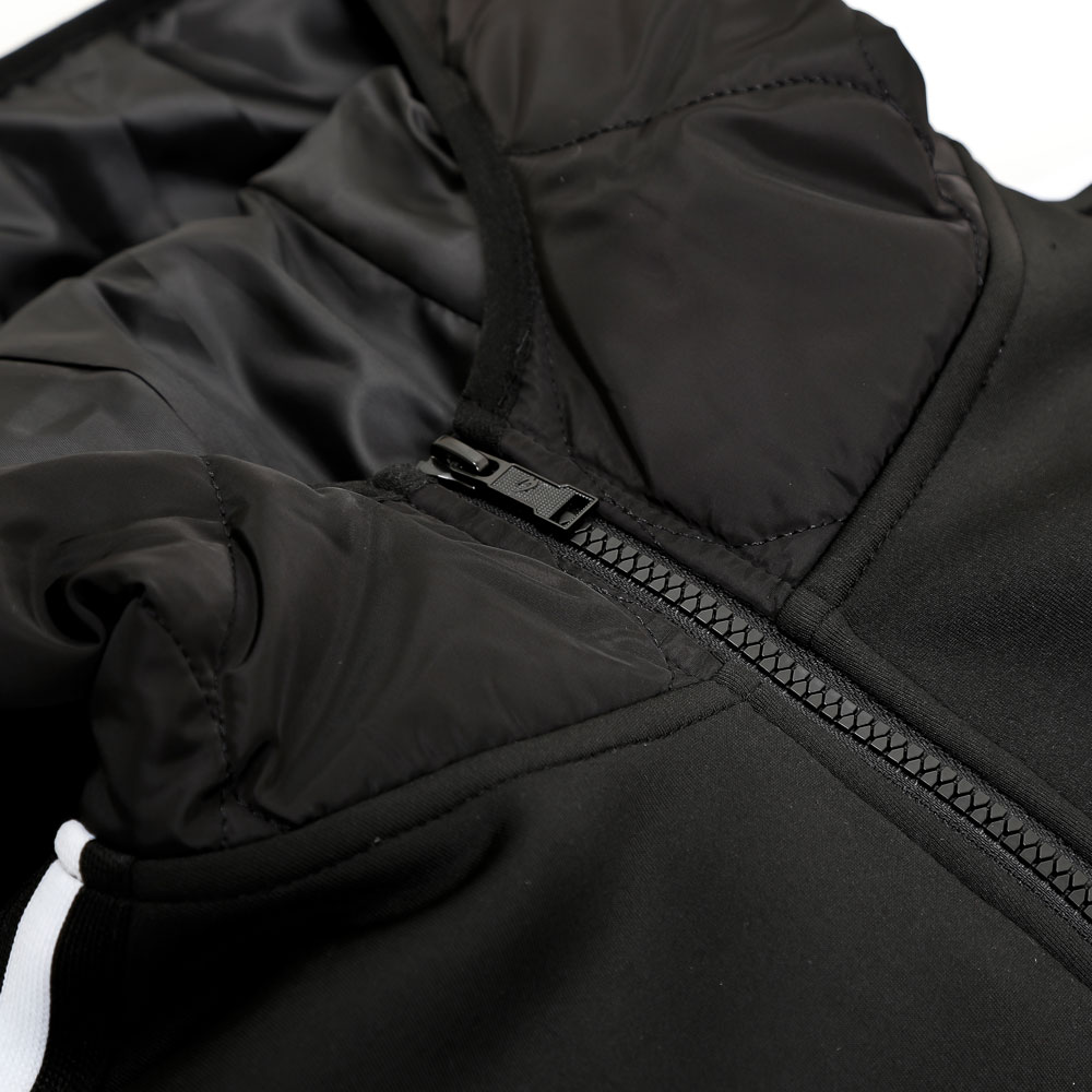 ストレッチ性のあるジャージ生地と暖かく柔らかいフリース生地をボンディングした生地を採用。適度な肉感とハリがあり、やわらかな風合いが特徴的で防寒対策も考慮しています。裏側のフリースもブラックにし、ブラックアウトにしました。袖下の一体カッティングは、腕の上が下ろしの際に腕の動きを妨げません。前身頃と後身頃、袖にワッシャー加工したナイロン生地を中綿キルトし切り替えてアクティブなデザインに仕上げました。脇のポケットは、リフレクターの圧着プリント仕様のファスナー。