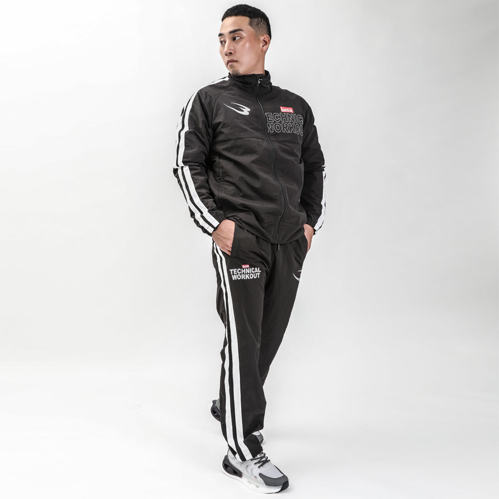 シワ感のある独特な風合いのナイロンワッシャー素材を採用。張りのある生地で耐久性と防風性を兼ね備えた優れもの。裏地はメッシュ仕様。軽やかな着心地ながらライトアウター感覚で着用できる程よいワイドシルエットが特徴のジャケットです。右胸のBロゴや左胸と後身頃の「TECHNICAL WORKOUT」のプリントは、夜間の視認性を考慮したリフレクタープリントにしました。両袖に2本ラインを入れスポーツミックススタイルに仕上げました。裾はドローコードで絞れる仕様で、トレーニング時のウェアのバタつきを抑えます。赤のシリコンバッジはデザインアクセントになっています。メンズサイズではありますが、女性の方でも問題なく着用していただけるユニセックスアイテム(男女兼用)です。