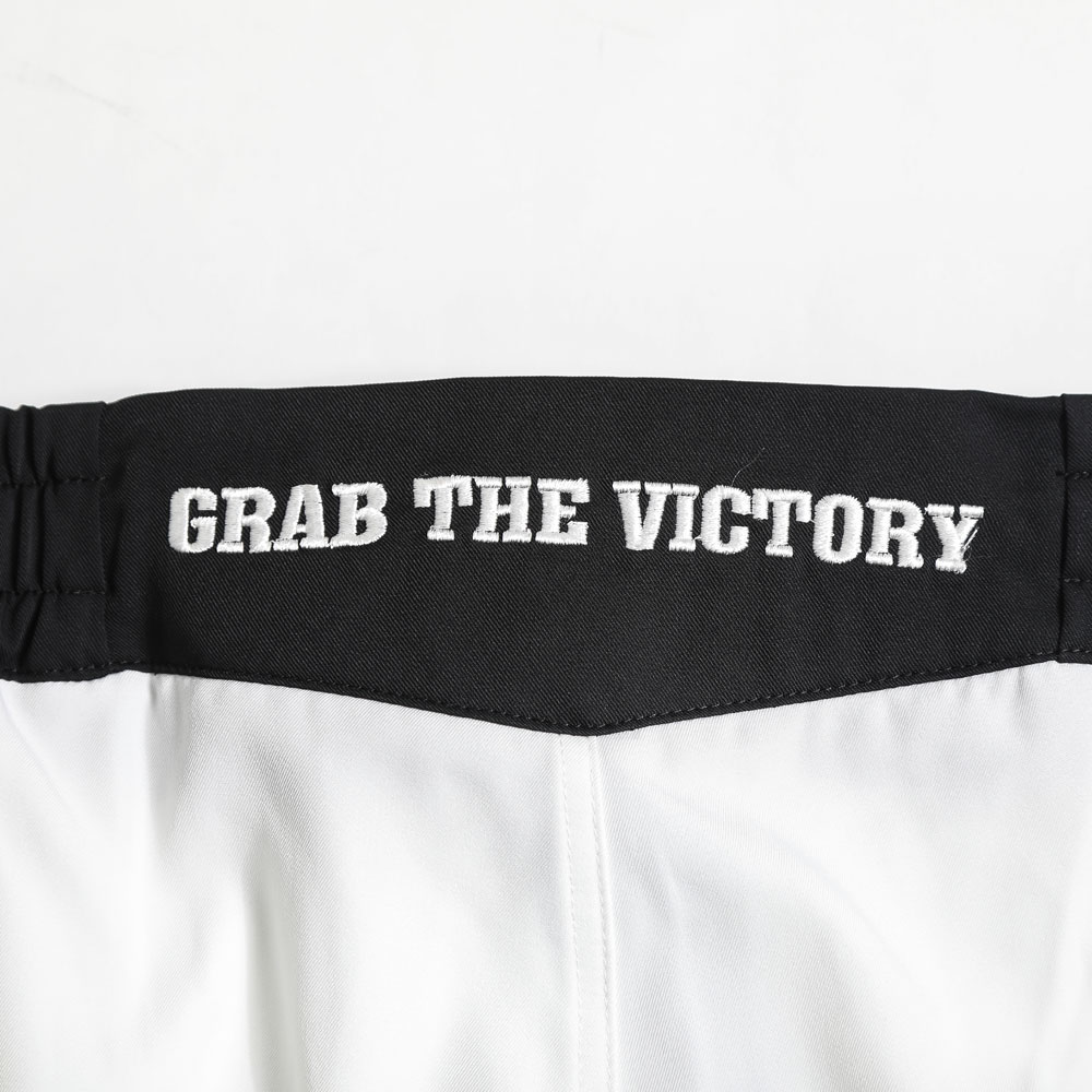 前ウエスト部分には「B BODYMAKER」のロゴを刺繍。後ウエストには「GRAB THE VICTORY」の文字を刺繍。前左裾には、Bロゴをプリント。カモフラージュ柄は昇華プリントでスタイリッシュに仕上げました。