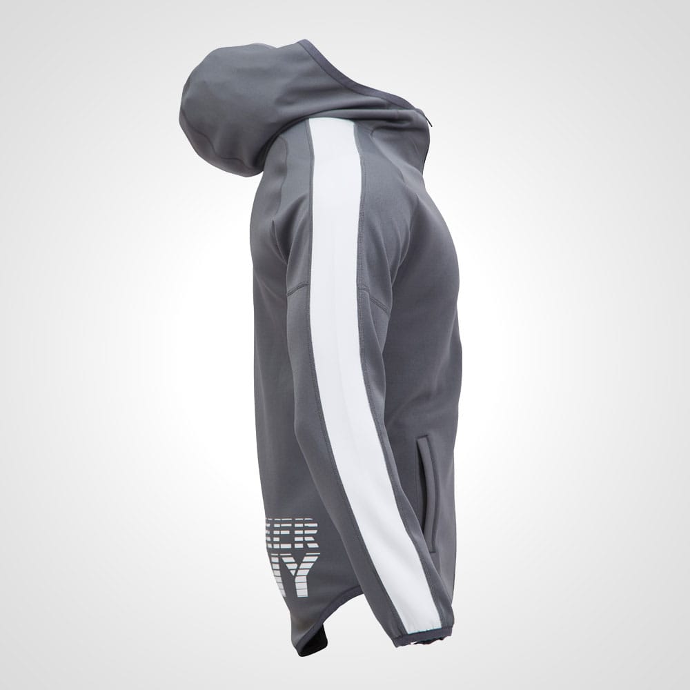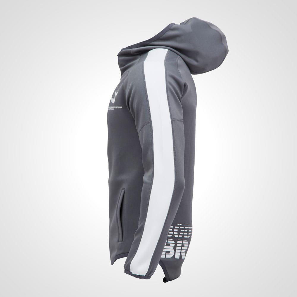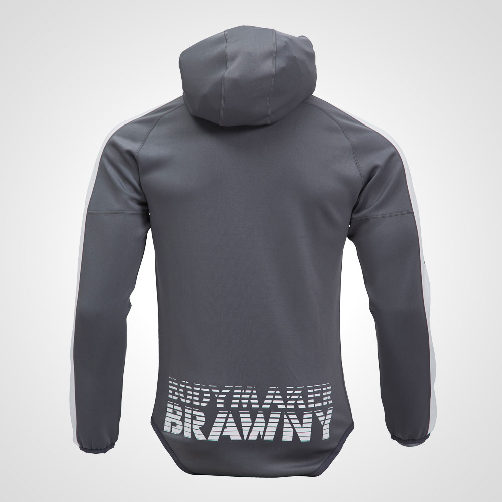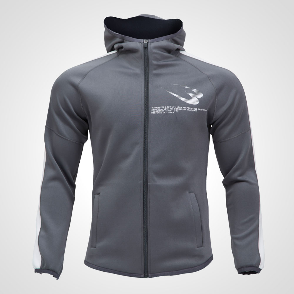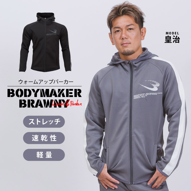 マシンの「BRAWNY」シリーズの世界観に合わせた、トレーニングに特化したウォームアップパーカー。あらゆる動きにフィットする素材を使用しています。ストレスフリーで、軽量で速乾性にも優れトレーニングに最適。袖口と裾はニットテープでパイピング仕上げで、軽い仕上がりになっています。後身頃の裾にブランドロゴの「BODYMAKER BRAWNY」がトレーニーのモチベーションを上げます。