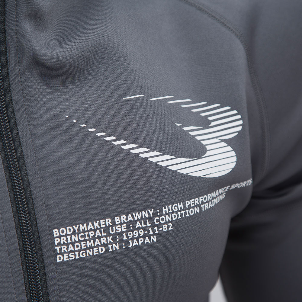 マシンの「BRAWNY」シリーズの世界観に合わせた、トレーニングに特化したウォームアップパーカー。あらゆる動きにフィットする素材を使用しています。ストレスフリーで、軽量で速乾性にも優れトレーニングに最適。袖口と裾はニットテープでパイピング仕上げして、軽い仕上がりになっています。後身頃の裾にブランドロゴの「BODYMAKER BRAWNY」がトレーニーのモチベーションを上げます。