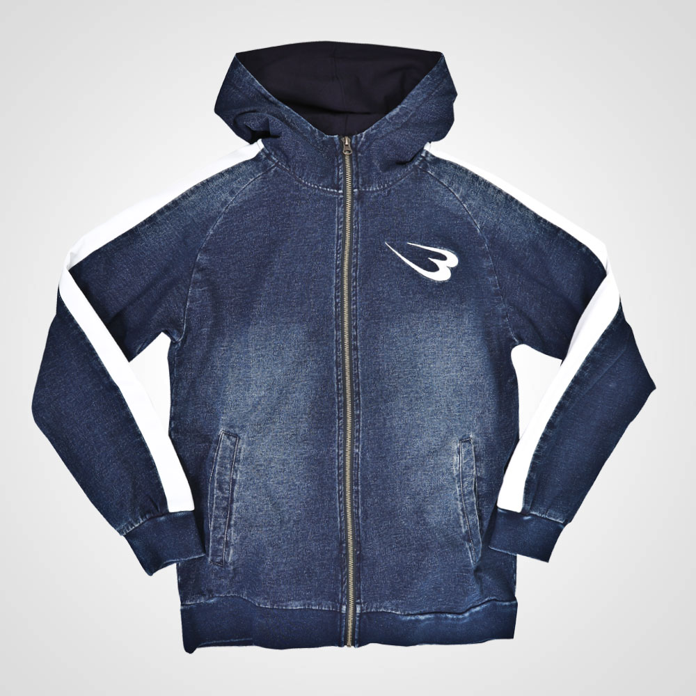 インディゴ染めして洗い加工したカットデニム素材にサイドラインをつけてトレンド感のあるパーカーに仕上げました。