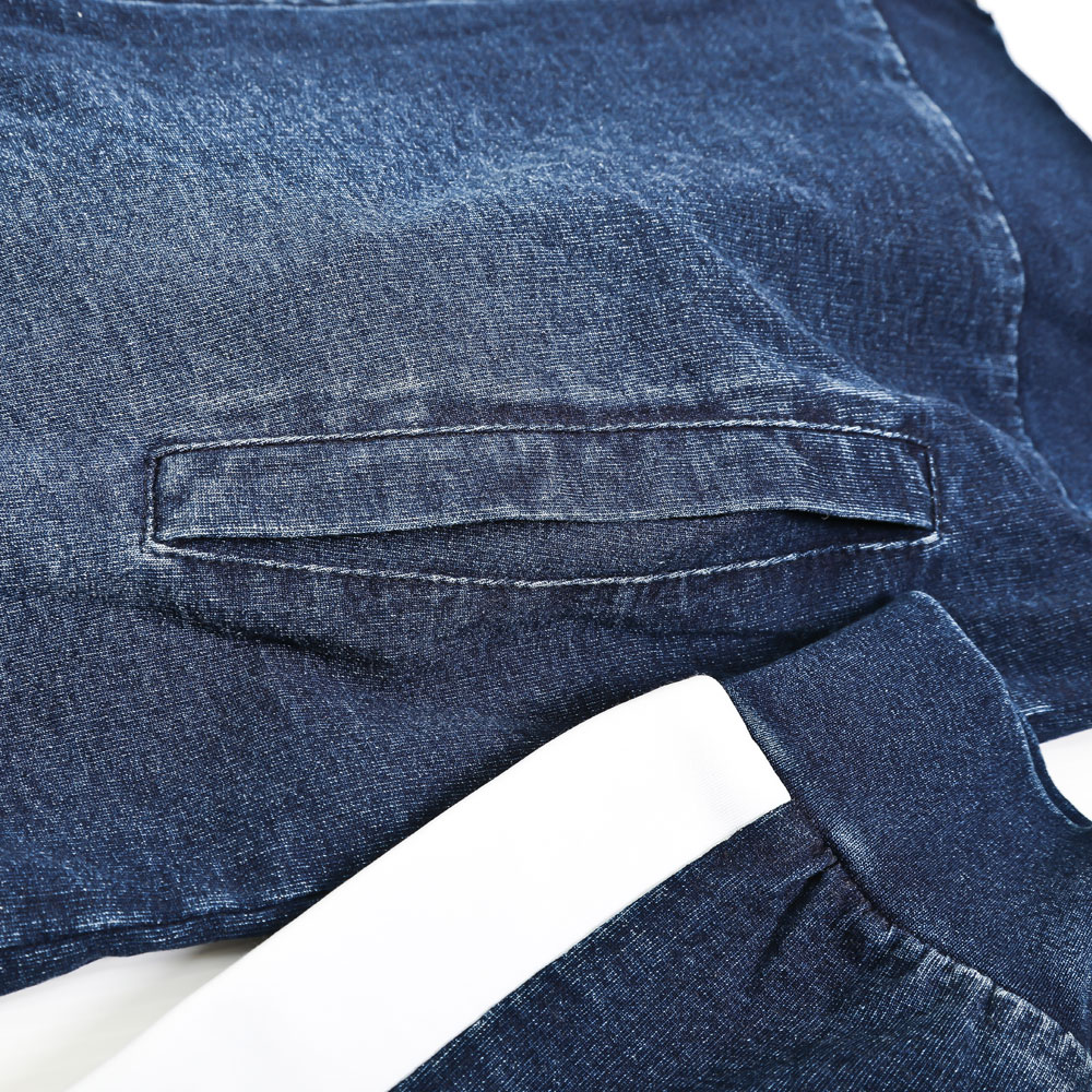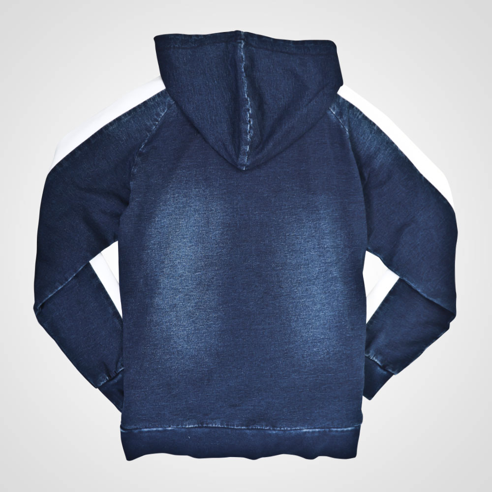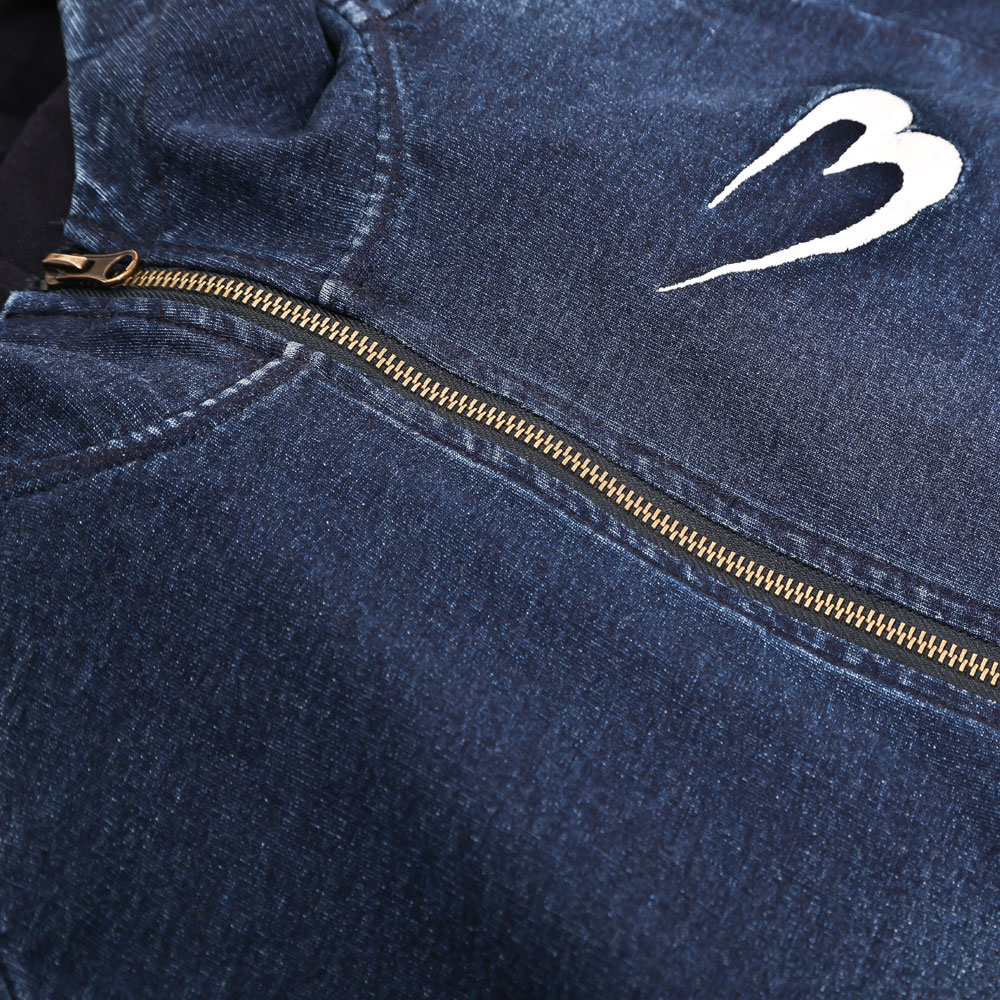 インディゴ染めして洗い加工したカットデニム素材にサイドラインをつけてトレンド感のあるパーカーに仕上げました。