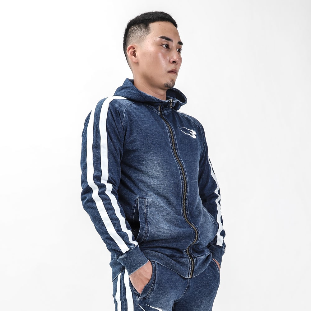 DENIMーKNIT デニムニット 2本ライン カットデニム ジャージ パーカー インディゴ染め 製品洗い加工 デニム スウェット ルームウェア トレーニングウエア