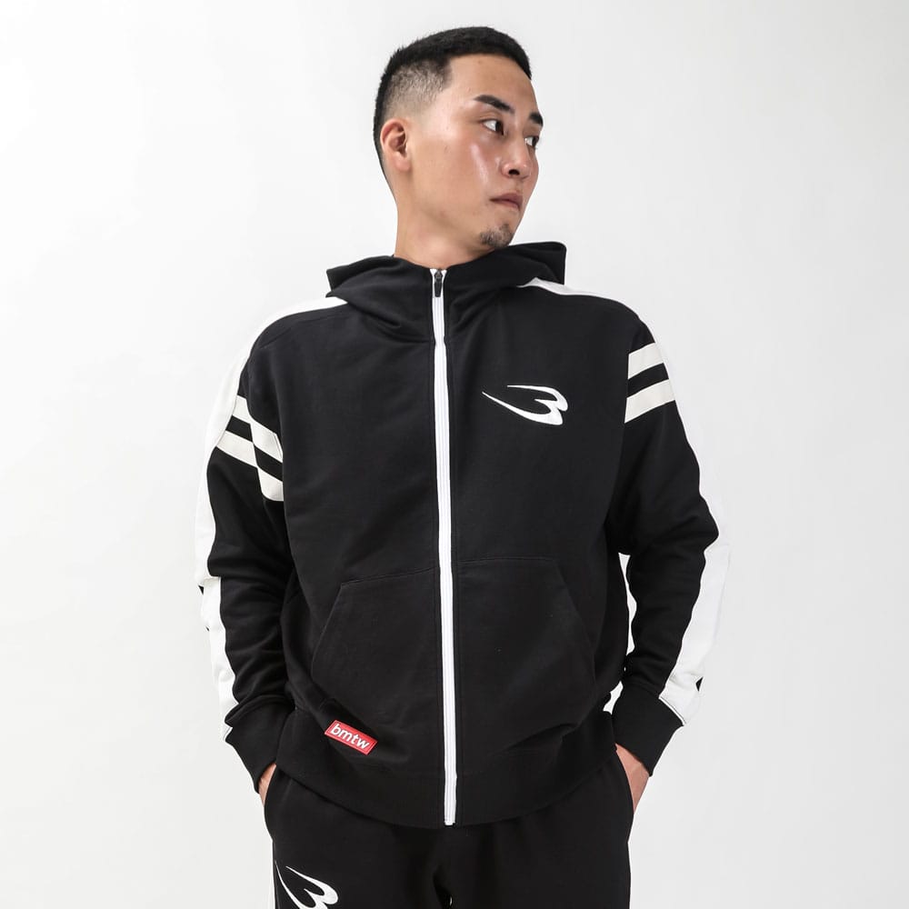 前身頃に「bmtw」のロゴ刺繍、後身頃には、「bmtw」のアイコンでもある2本ラインをリフレクタープリント。