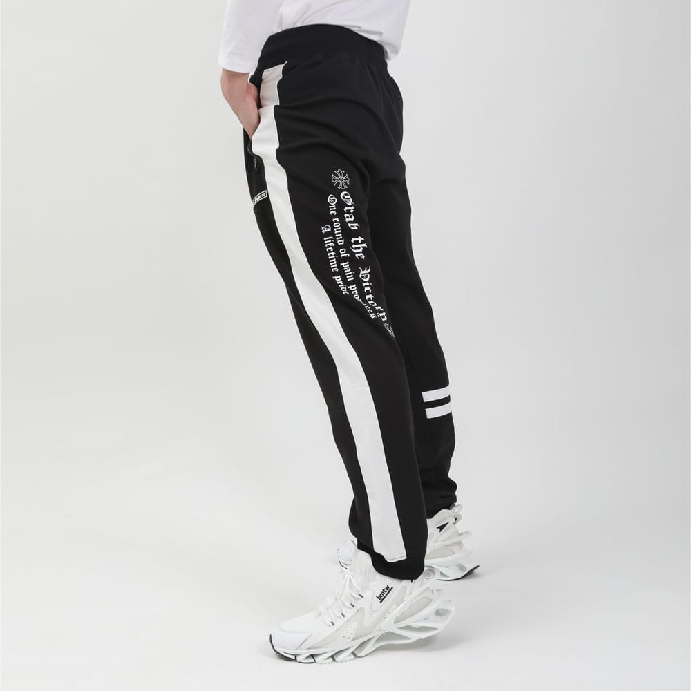 独自の裏起毛素材を使用することで、保温性を高め寒い季節でも快適に着用していただけます。また、肉厚のボリュームのある素材感は、保温性さけでなく軽くてしっかりとして、綿とポリエステル・ポリウレタン素材なので、運動中の汗を素早く吸収し、ドライな状態に保ってくれます。右ファスナーポケット下に「+B」のロゴプリント。左ファスナーポケット下には「+B」のシリコンバッジ。そして、その下には2本のブラックラインをプリント。右脚に白の2本ラインプリント。両脚の内側を切り替え、ゴシックの文字プリント。黒を基調に白のプリントで「+B」の世界観を演出しています。裏起毛素材なので、寒い季節のトレーニングやウォーミングアップのみならず、タウンユースでも活躍できるロングパンツです。オーバーサイズなシルエットはトレンド感があり、リラクシングさせてくれます。