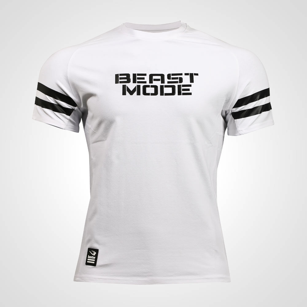 胸に立体感のある「BEAST MODE(獣モード)」のロゴをプリント。両袖にアイコンの2本ライン。右裾にはシリコンバッジ。