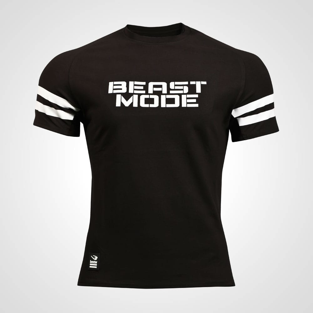 胸に立体感のある「BEAST MODE(獣モード)」のロゴをプリント。両袖にアイコンの2本ライン。右裾にはシリコンバッジ。