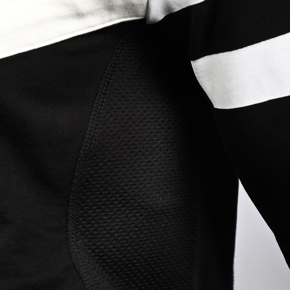 ストレスのないストレッチの効いた伸縮性の生地と肌触りの良さ。見た目より丈夫で耐久力のあり、機能性と着心地が融合された生地。スリムでフィット感のあるシルエットがボディのラインを綺麗に見せる。裾と袖口をリブ仕様にしたことで、フィット感が向上しトレーニング中もウエアが気になりません。脇の切替えは、ストレッチ性のあるメッシュ素材を採用し、トレーニングでの汗や熱気をスムーズに排出して、快適なコンディションでトレーニングに打ち込め、腕などの可動域を出す為、脇から袖下まで一枚もので裁断しています。機能性と実用性を兼ね備えた一枚になっています。