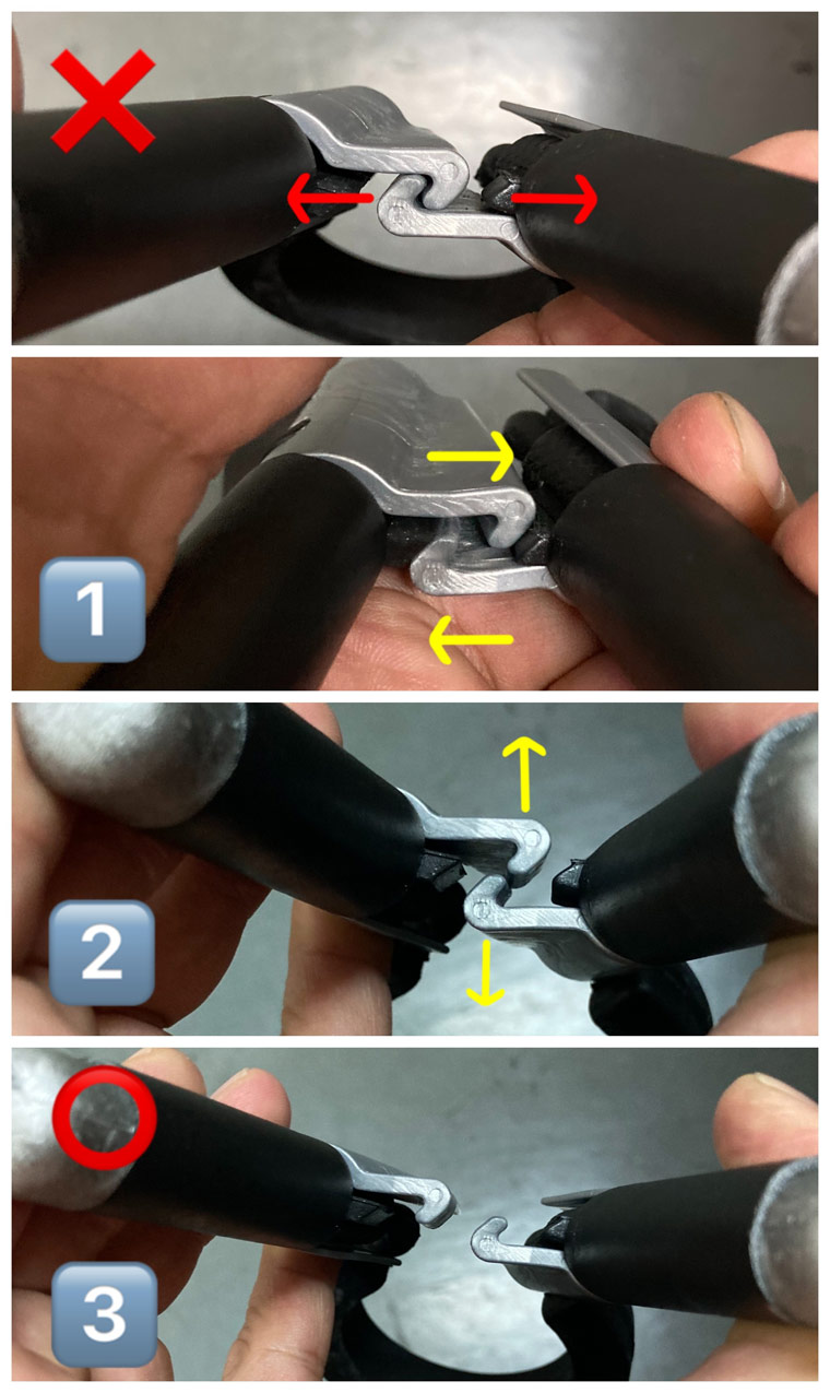 ■正しい外し方 1:手持ちバーをしっかり握る バーが安定するように強めに握ります。 2:手持ちバーを上下方向にひねる フック同士が引っかかっている部分が外れるように、 片方を上へ、もう片方を下へねじります。 3:フックが外れたことを確認してから開く フック同士のかみ合いが完全に外れたのを確認して、 バーを左右に開けば、シャフトから破損なく取り外せます。