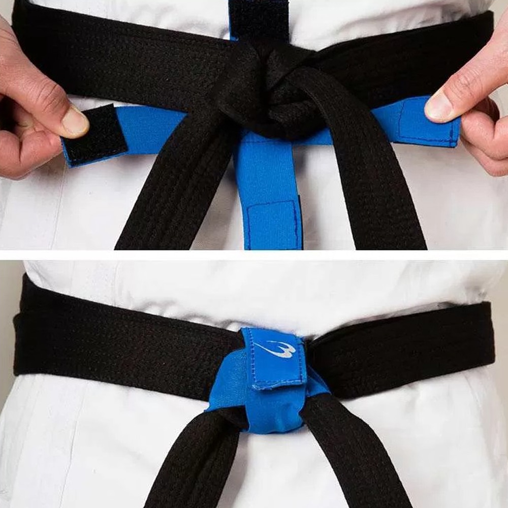 取り付けは簡単な面テープ。空手衣の帯の緩みをなくし、帯がほどけるのを防ぎます。練習や試合につきものの激しい動きにも安心です。