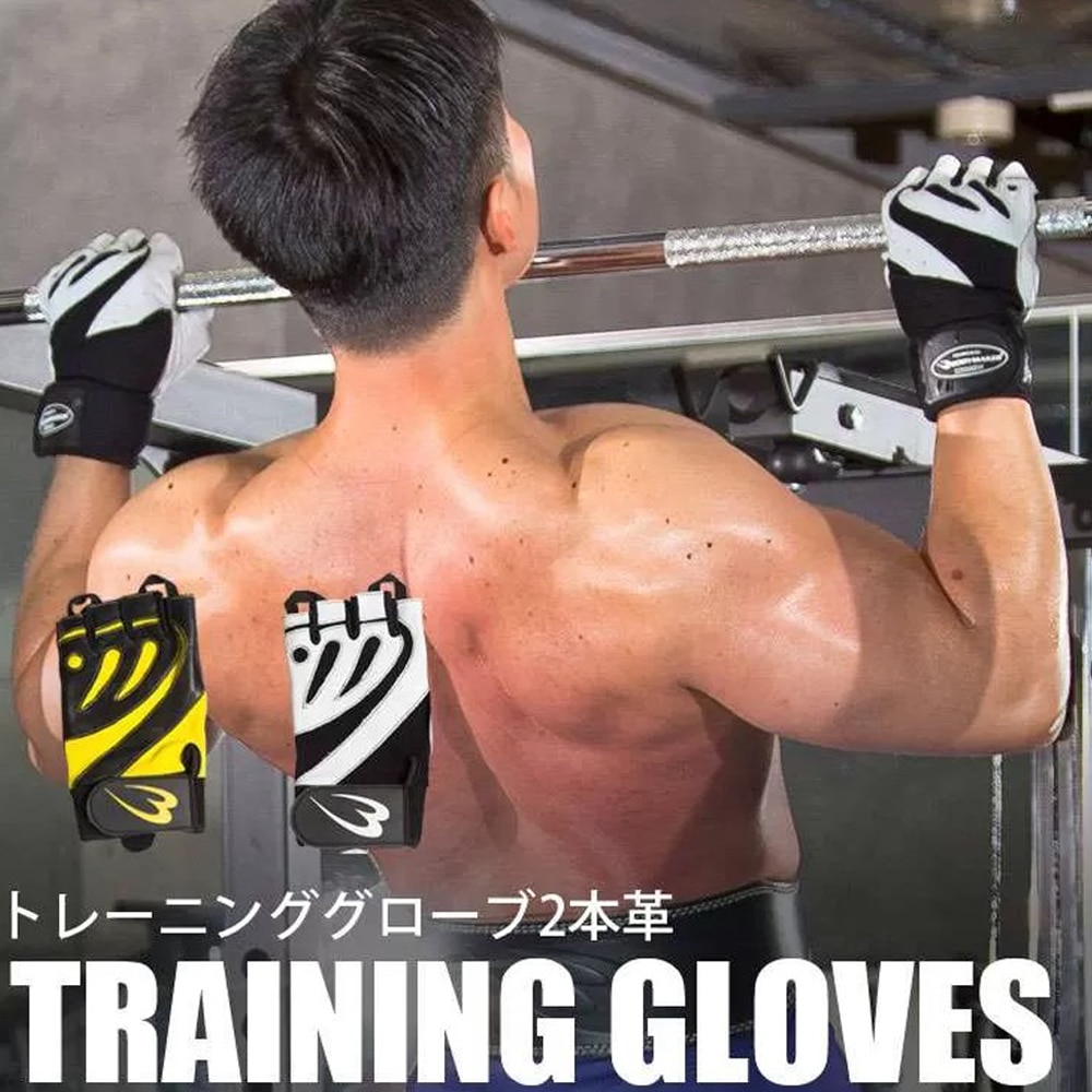 トレーニング用、指抜きタイプの本革製グローブ。ウエイトトレーニングでの、手のひらのケガやマメの防止に。手のひら側には2種類の生地を使用しグリップ性とクッション性を向上しています。リストストラップはロングタイプで、手首をしっかり固定します。