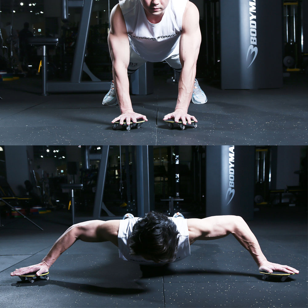普通のプッシュアップではもの足りない方にぴったり。グリップ部分が回転式になっているプッシュバーです。運動中は常に姿勢を安定させることが要求されるので、通常プッシュアップで鍛えられる腕や胸の筋肉だけでなく、さまざまな部分の筋肉が刺激されます。