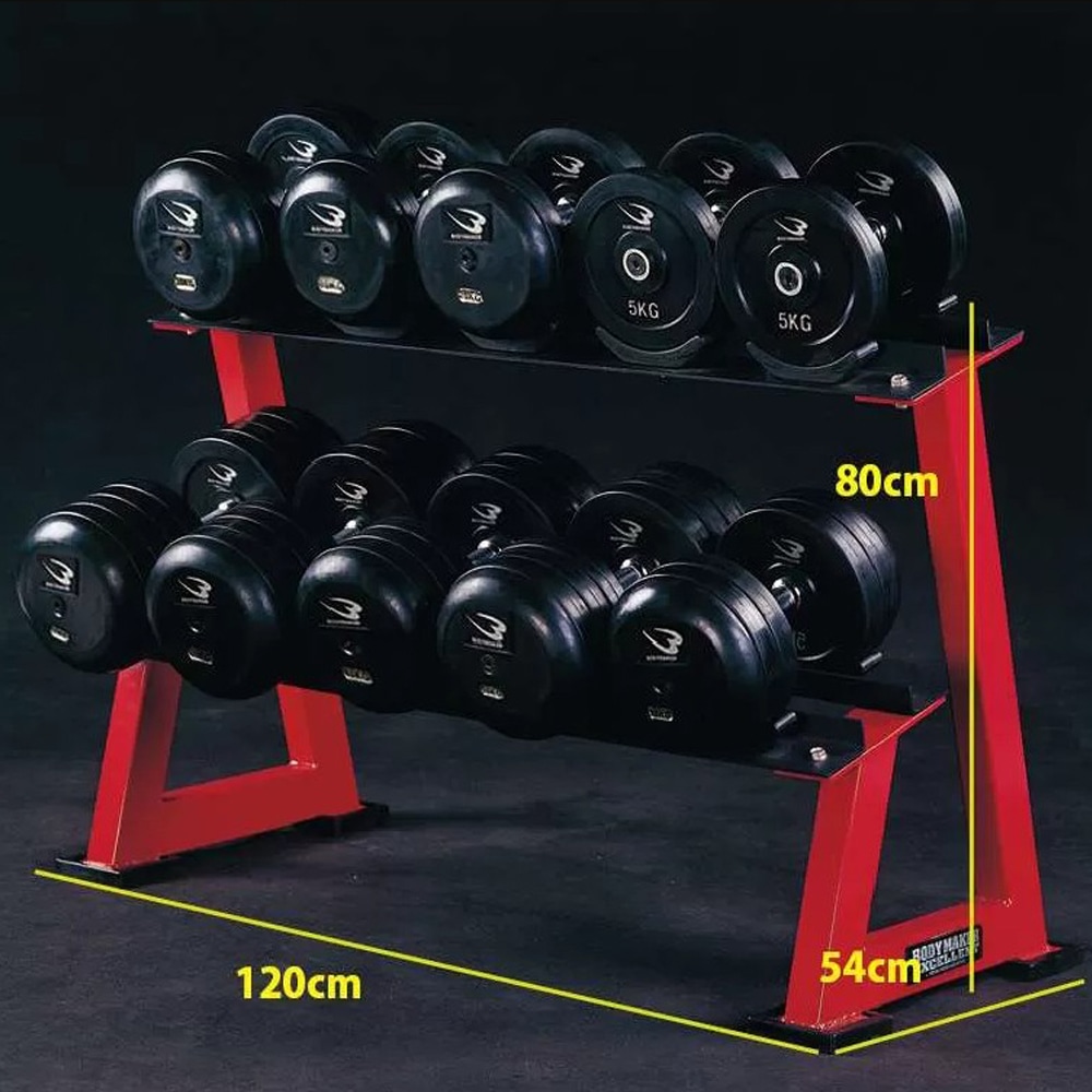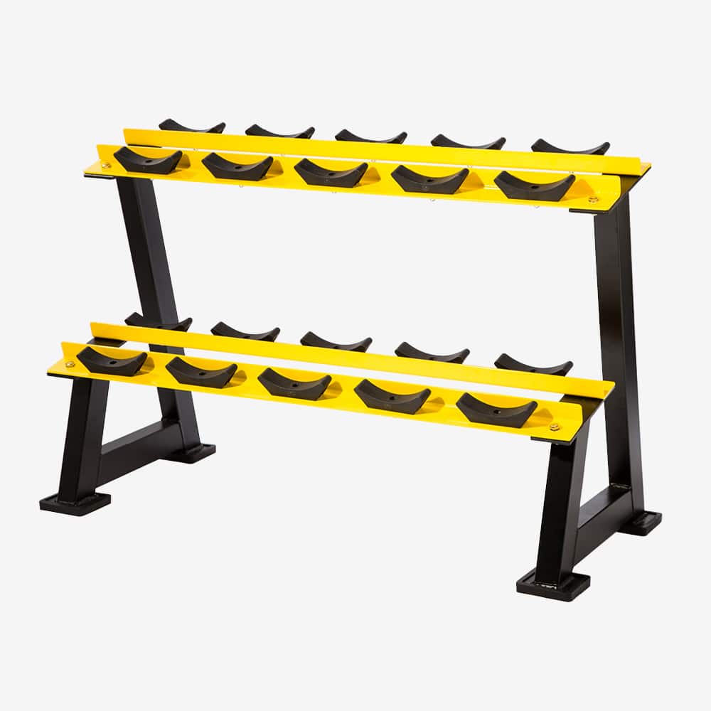 上下2レーンに系10本のダンベルが収納できます。プレート受けには硬質ラバーを使用していますので、プレートを傷つけません。