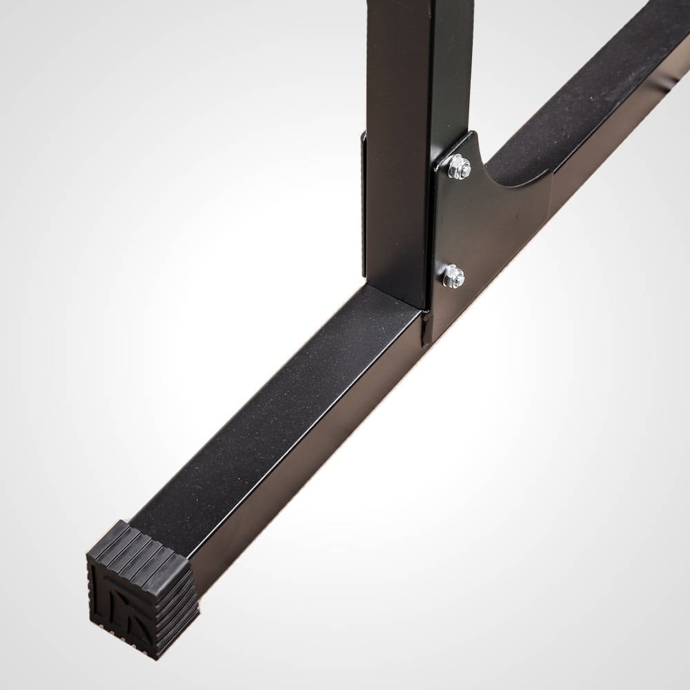 プレートの収納に。トレーニーのレベルに合わせて頻繁に入れ替えられるプレートは、平面に直接置くよりラックに収納する方が、出し入れがスムーズになります。高耐久フレーム構造。大量のプレートを収納する事が可能です。