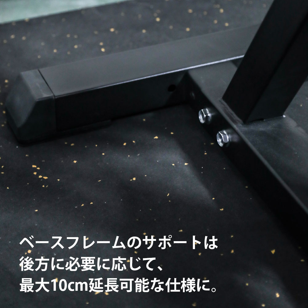 ベースフレームは転倒防止を考慮した延長構造を採用。奥行きは81.5~91.5cmの範囲で調節が可能で、トレーニング内容に応じて安定性を最適化できます。