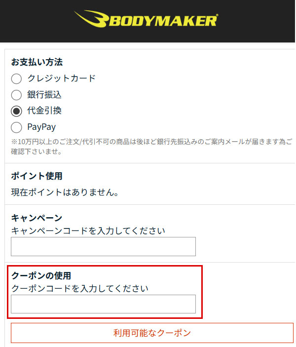 画面の下へ移動しますと、クーポンコード記入箇所がございます。取得した14桁のコードを記入します。(-ハイフンも記入して下さい。)