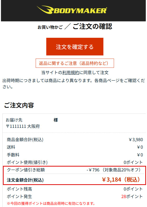 ご注文情報の確認ページが表示されます。【注文金額合計(税込)】の合計金額が、クーポンでお値引きされた価格となっているかをご確認下さい。【注文を確定する】に進むとご注文が確定されます。