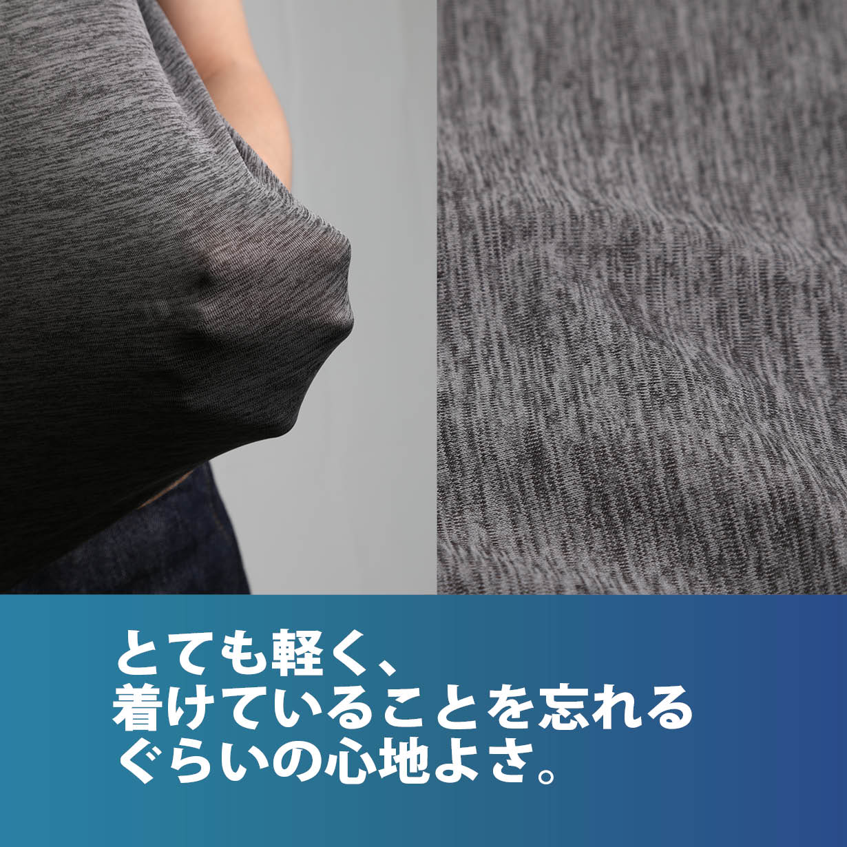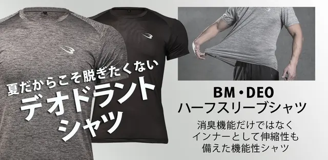 BM・DEOハーフスリーブシャツは消臭機能だけではなく、汗が乾くときに、気化熱により接触面がひんやりとするため、このシャツを着用することでより涼しくなります。また伸縮性も抜群で激しい動きをしても動きを妨げず快適にスポーツなどを楽しめます。