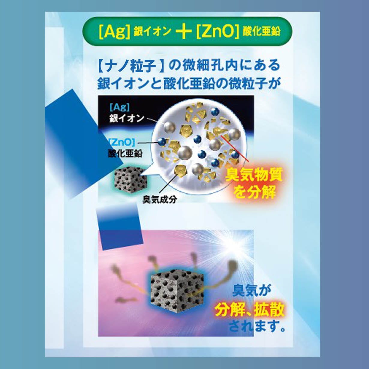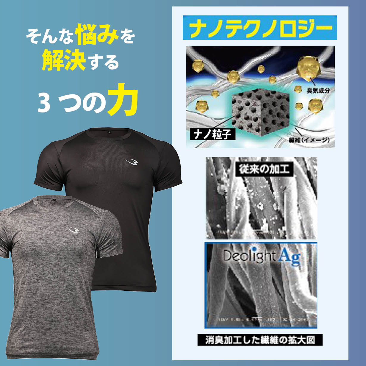 汗とニオイを徹底的にブロックする‼強力な消臭パワーでスッキリ!強力消臭の仕組みは3つの力の相乗効果、1つ目はナノサイズのテクノロジー、2つ目はナノ粒子がニオイの臭気成分が吸着!3つ目は【[Ag]銀イオン+[ZnO]酸化亜鉛】ナノ粒子の微細孔内にある銀イオンと酸化亜鉛の微粒子が臭気物質を分解。